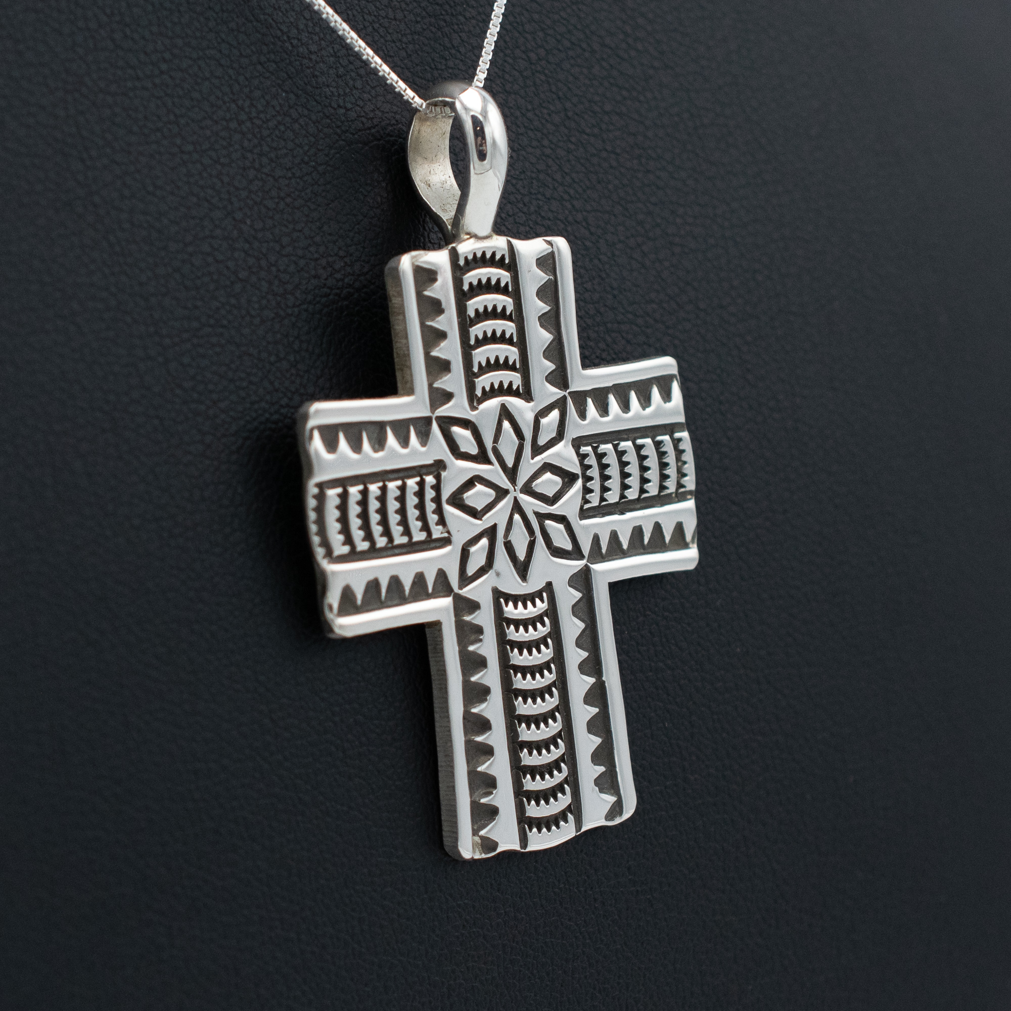 Stamped Sterling Silver Cross Pendant by Bryant Martinez, Navajo.