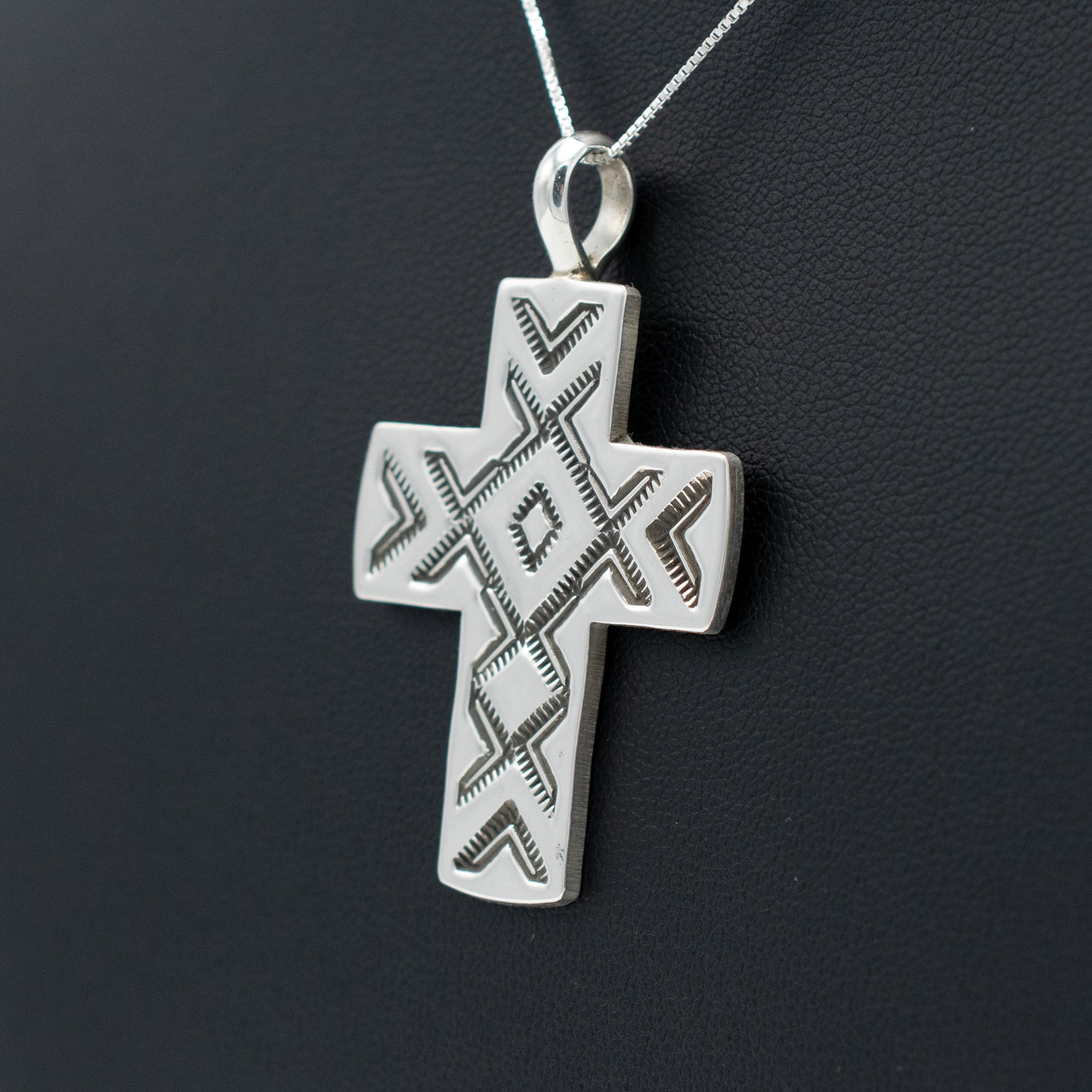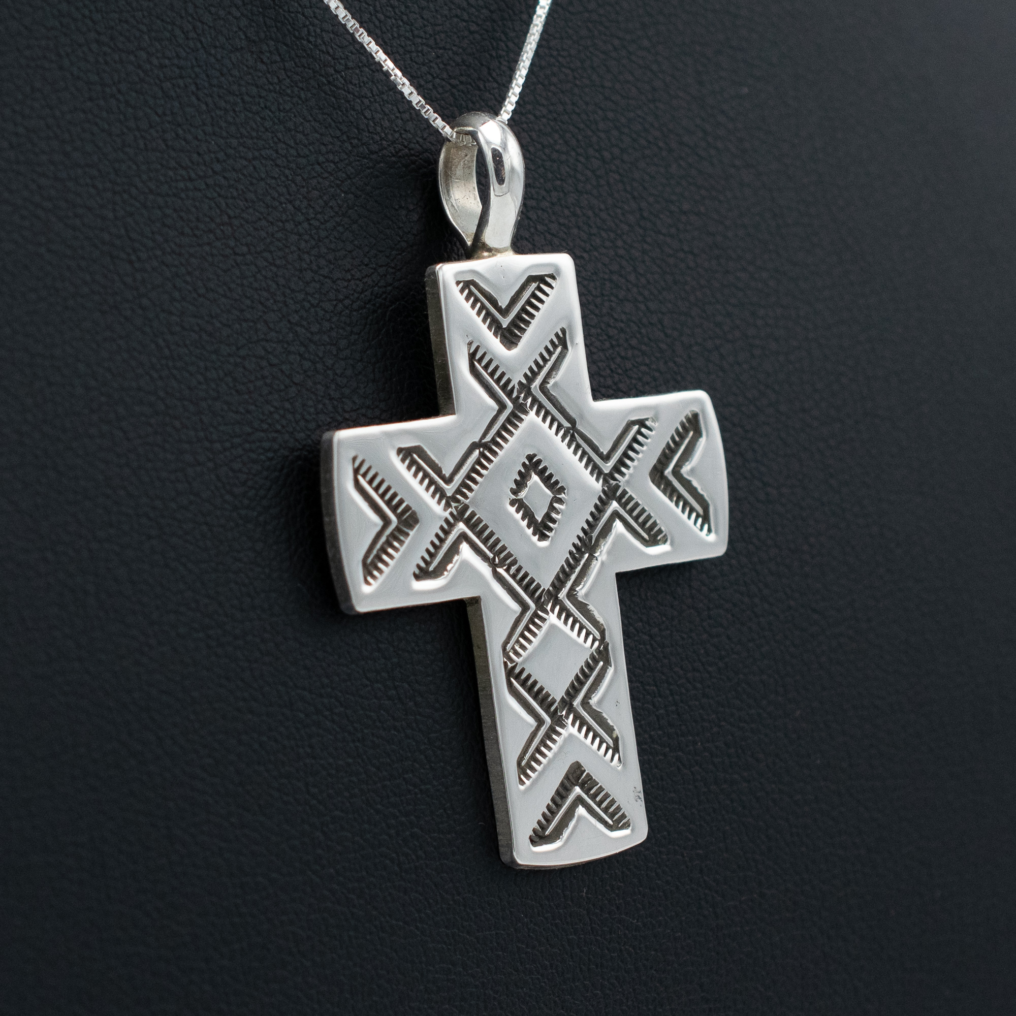 This handcrafted sterling silver cross pendant by Navajo artist Bryant Martinez showcases intricate hand-stamped designs that add depth and dimension to its bold silhouette. The geometric patterns reflect traditional Navajo artistry, making this piece a striking symbol of cultural heritage and craftsmanship. Perfect as a statement accessory or a meaningful gift, this pendant embodies timeless elegance and spiritual significance.