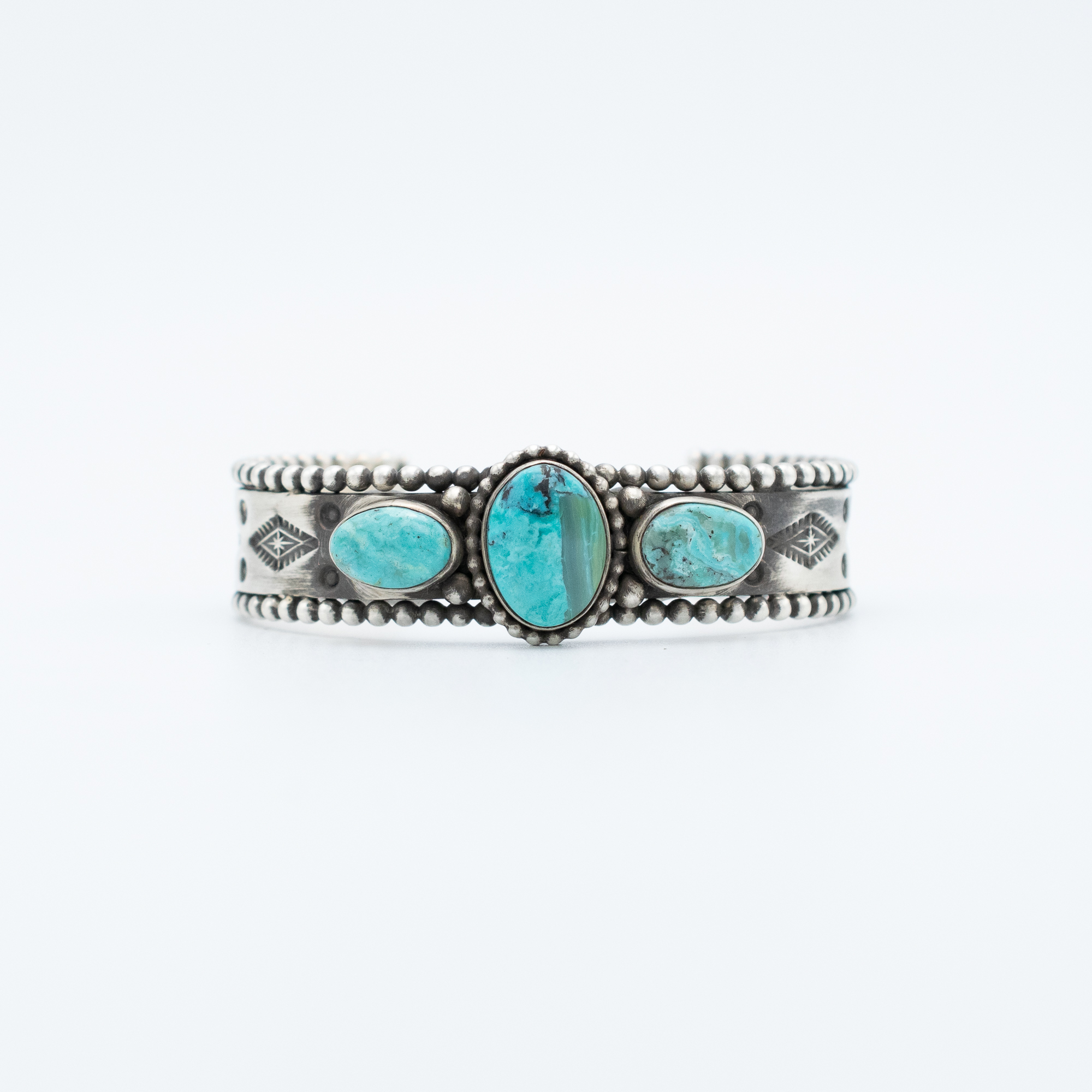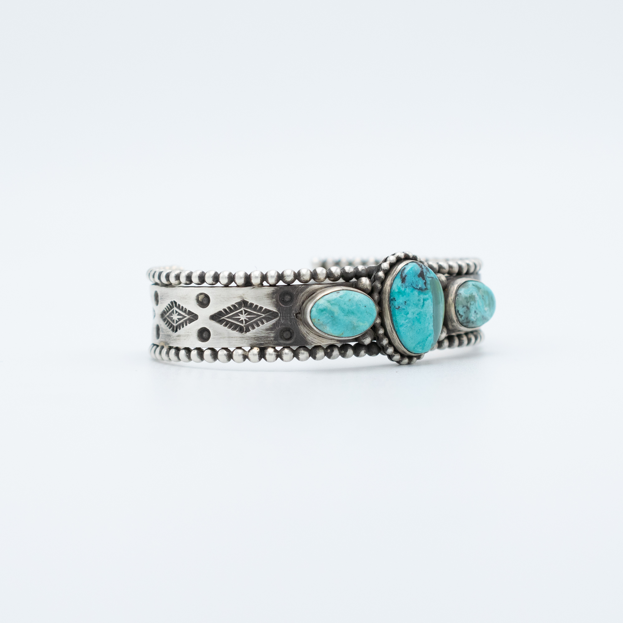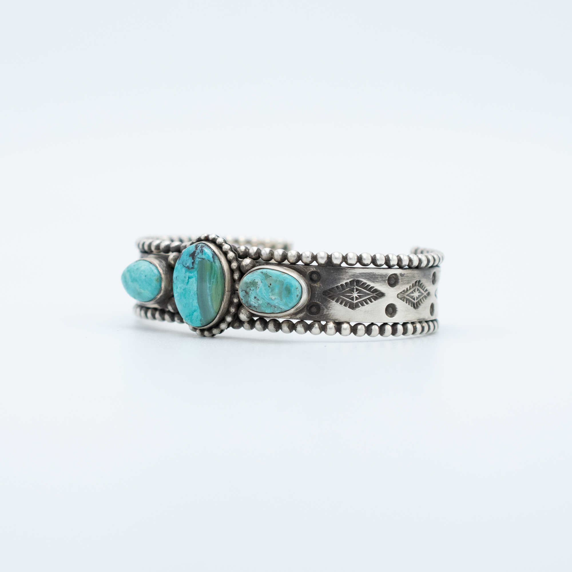 This natural Stormy Mountain Turquoise bracelet by Navajo artist Bryant Martinez features three striking turquoise stones in varying hues of blue, each set in smooth sterling silver bezels. The bracelet is bordered with delicate silver beading and accented by hand-stamped designs along the band, adding depth and texture. A bold and timeless piece, handcrafted with traditional techniques and rich in character.