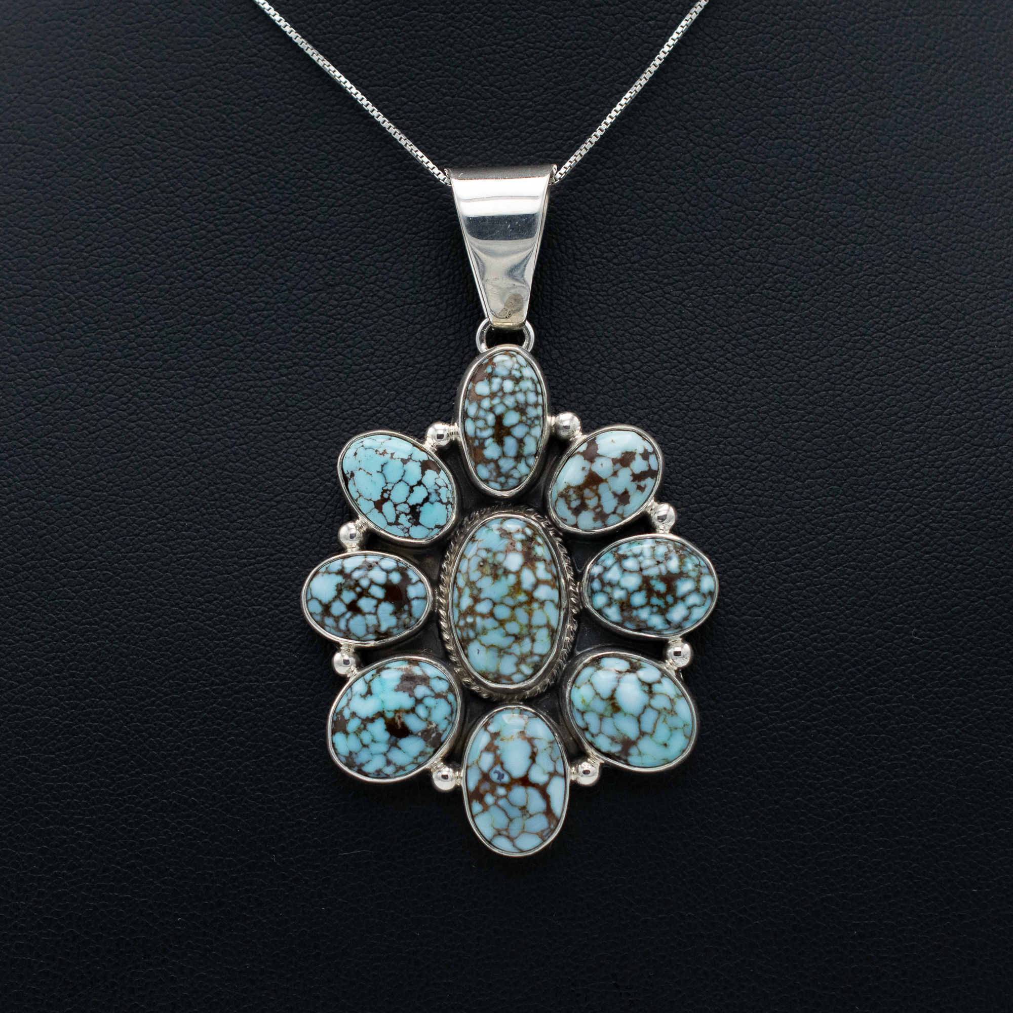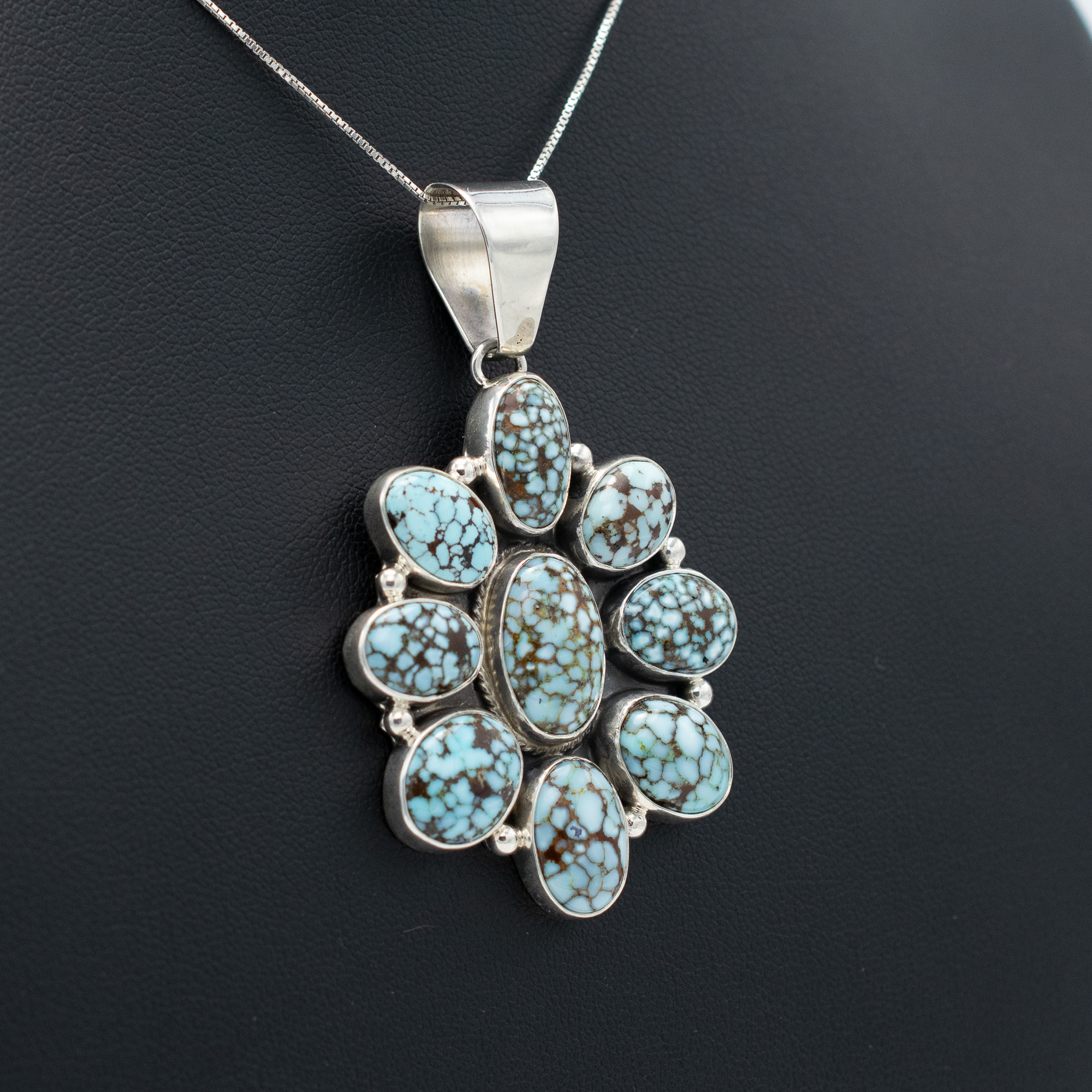 This Natural Timberline Turquoise Cluster Pendant by Navajo artist Georgia Ann Curley is a stunning showcase of intricate craftsmanship and natural beauty. Featuring an array of richly webbed turquoise stones, each with a distinct matrix, this pendant radiates timeless elegance. Set in sterling silver with delicate bead accents, the cluster design creates a bold yet balanced aesthetic. A generous bale allows for easy pairing with your favorite chain or beads, making this piece a striking addition to any collection.