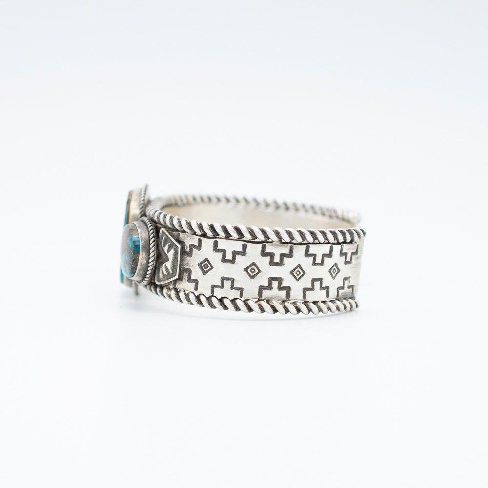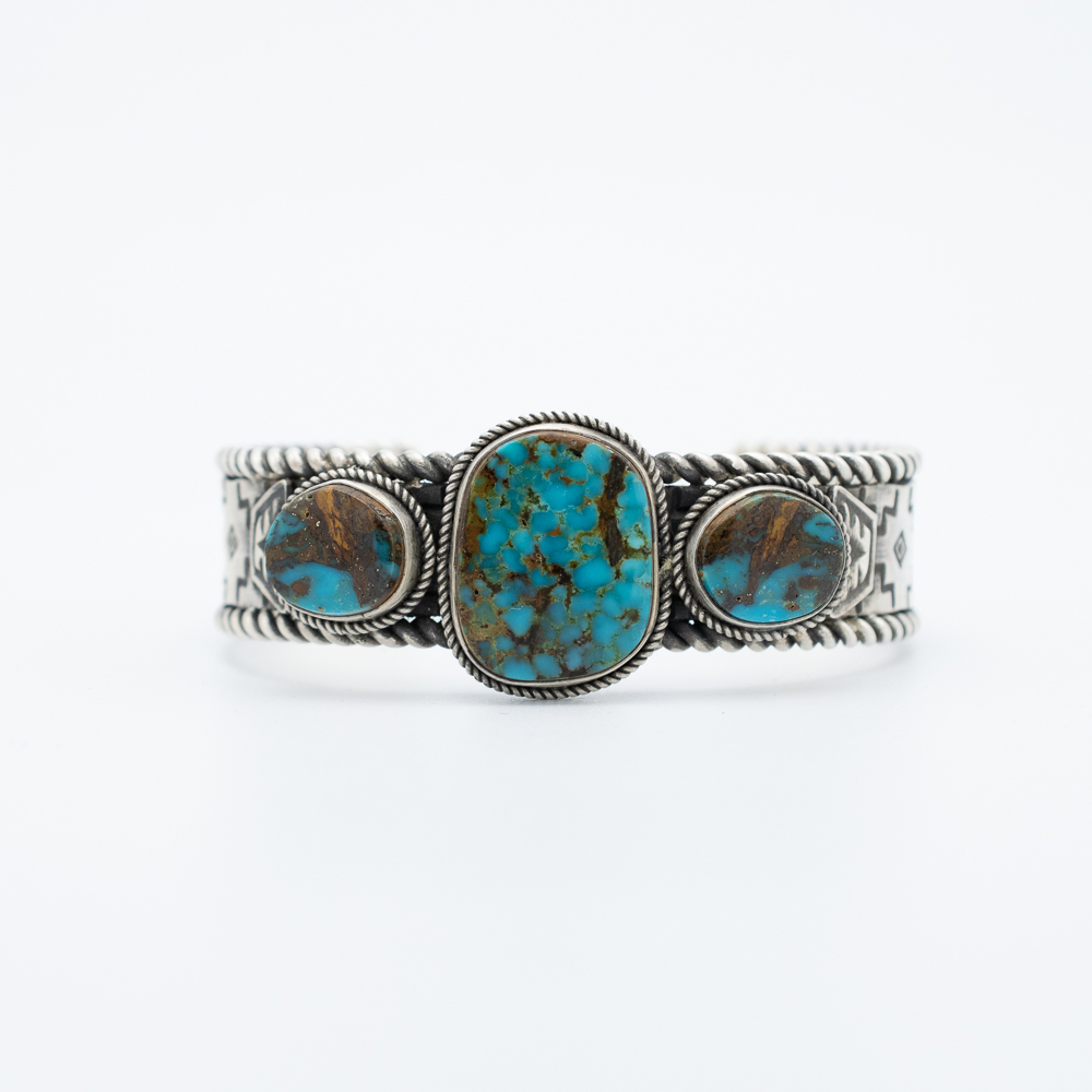 This exquisite bracelet features three striking Stabilized Turquoise Mountain turquoise stones, each set in a sterling silver bezel. The stones are beautifully complemented by a detailed sterling silver band adorned with intricate hand-stamped geometric patterns and framed by twisted rope edges. Crafted by Navajo artist Bryant Martinez, this bracelet exudes boldness and timeless elegance.