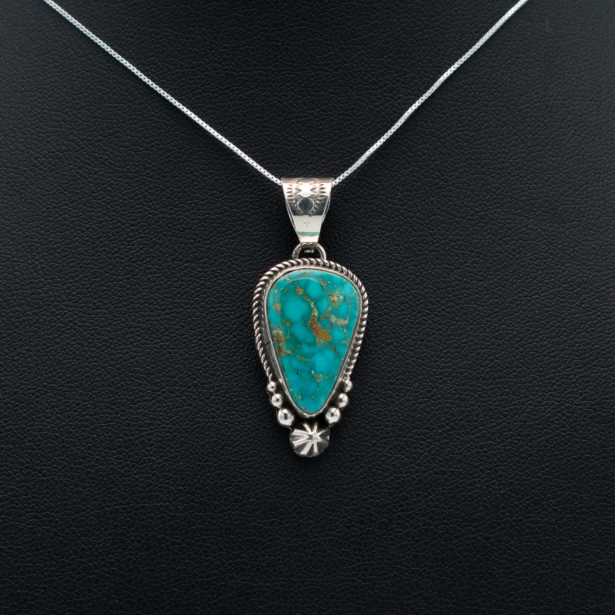 This Natural Turquoise Mountain Pendant by Navajo artist Ruth Ann Begay features a striking blend of green and blue tones with a warm golden matrix. Set in a detailed sterling silver setting with twisted wire, silver drops, and a stamped bail, this pendant offers timeless elegance and handcrafted beauty inspired by the Southwest.