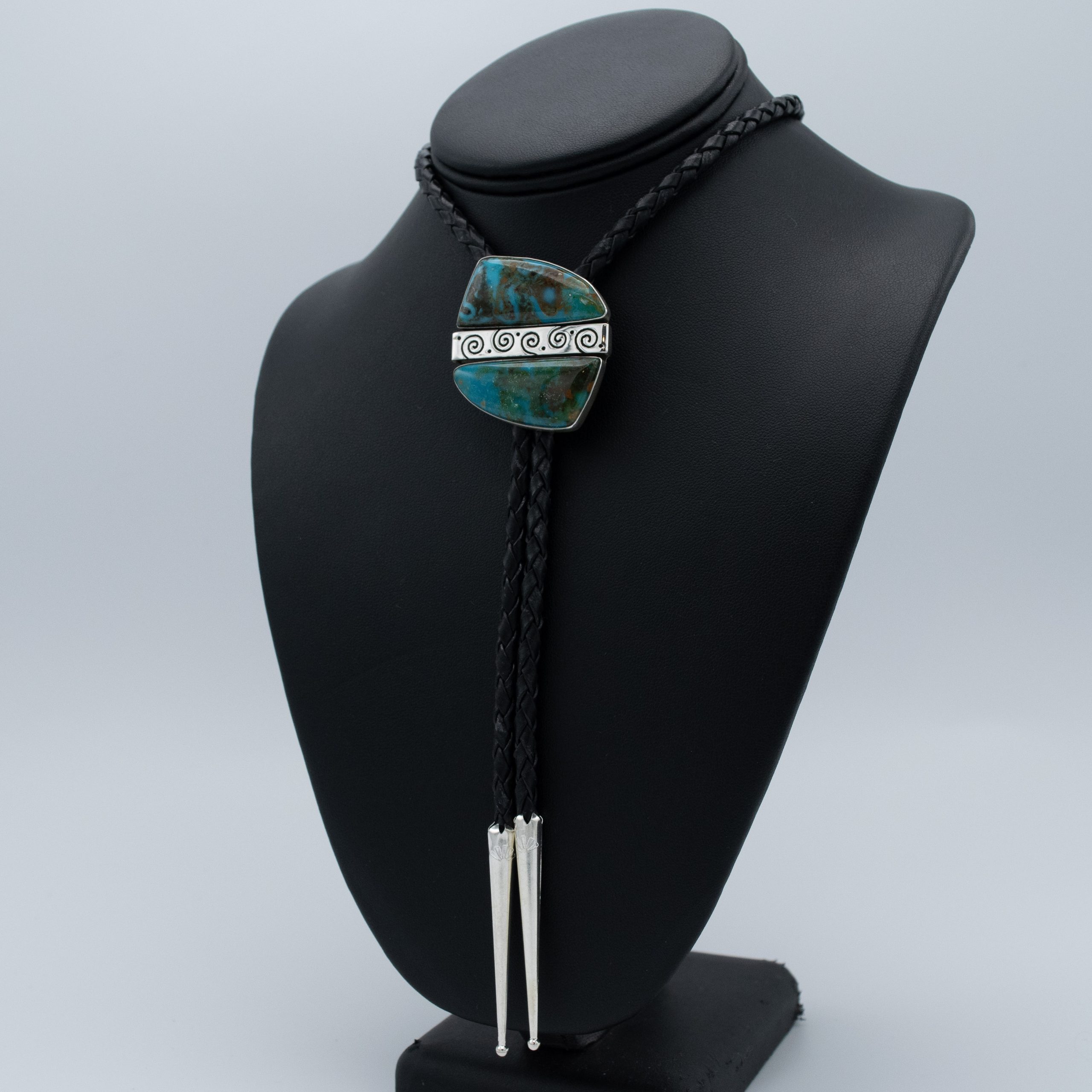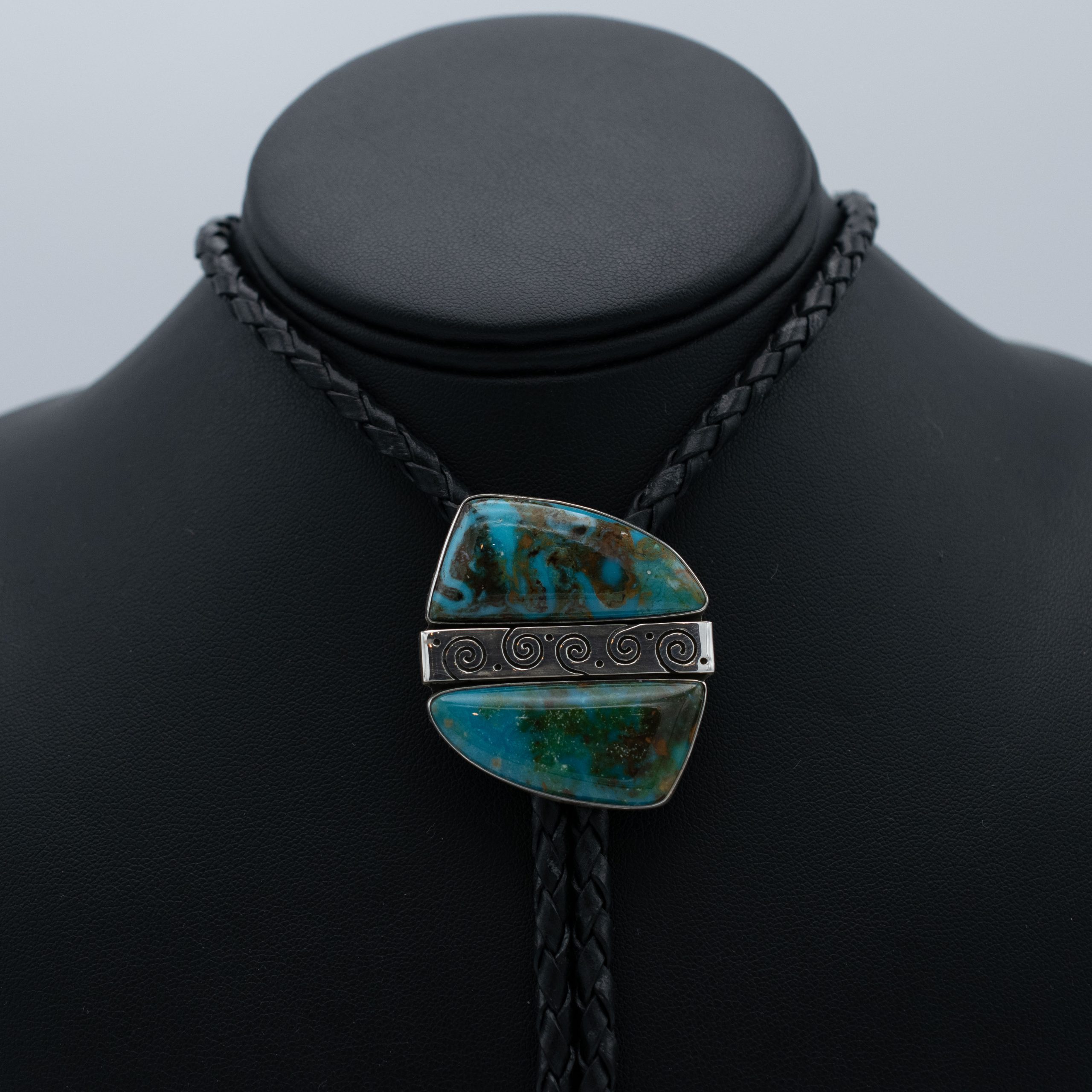 This Turquoise Mountain Whirling Log Bolo Tie by Navajo artist Bryant Martinez showcases a unique design featuring dark and stormy turquoise stones separated by a sterling silver whirling log overlay design. This bolo tie represents a blend of cultural symbolism and artistic craftsmanship, highlighted by the beautifully polished stones and intricate silverwork. Set on a traditional braided cord, it adds a touch of timeless Southwestern elegance and rich heritage to any ensemble.