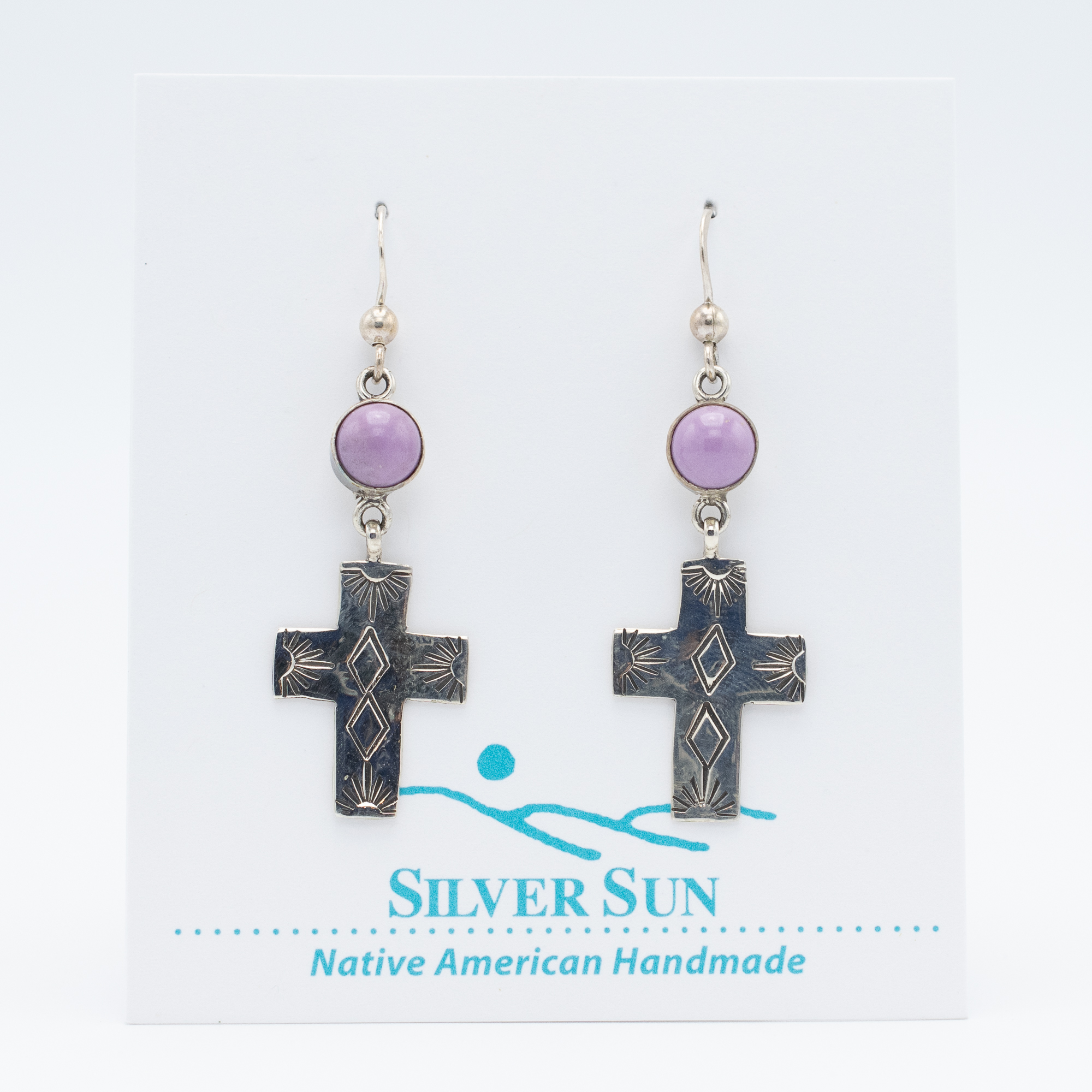 These Valentine Cross Earrings by Navajo artisan Ruth Ann Begay feature hand-stamped sterling silver crosses paired with soft purplish pink gemstones. A beautiful blend of tradition and romance, perfect for a meaningful gift or Valentine Cross Earrings by Ruth Ann Begay, Navajo.a personal keepsake.