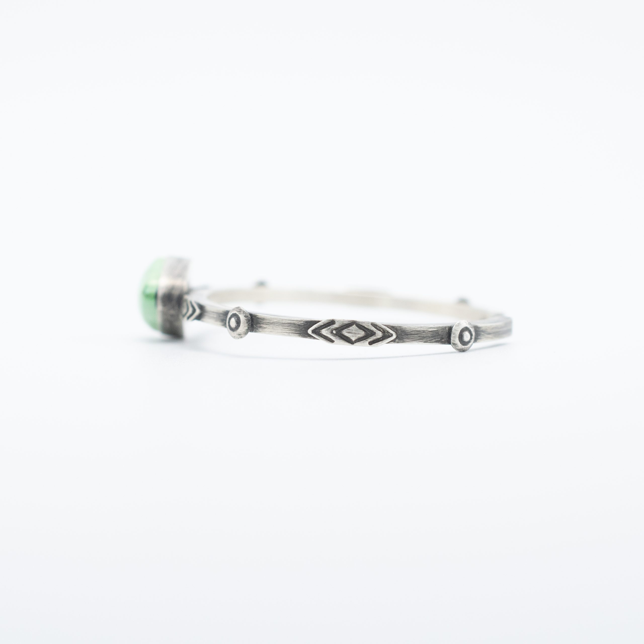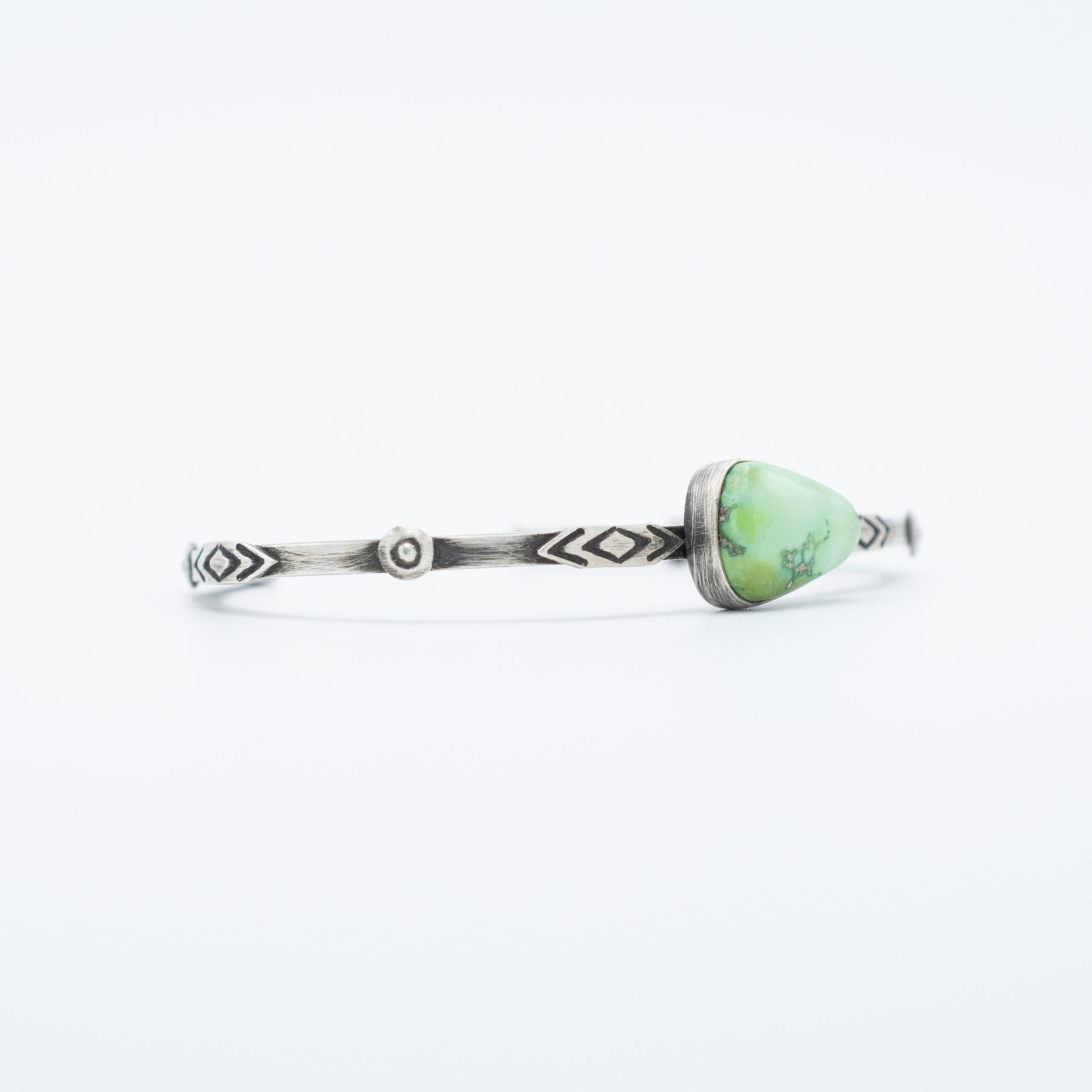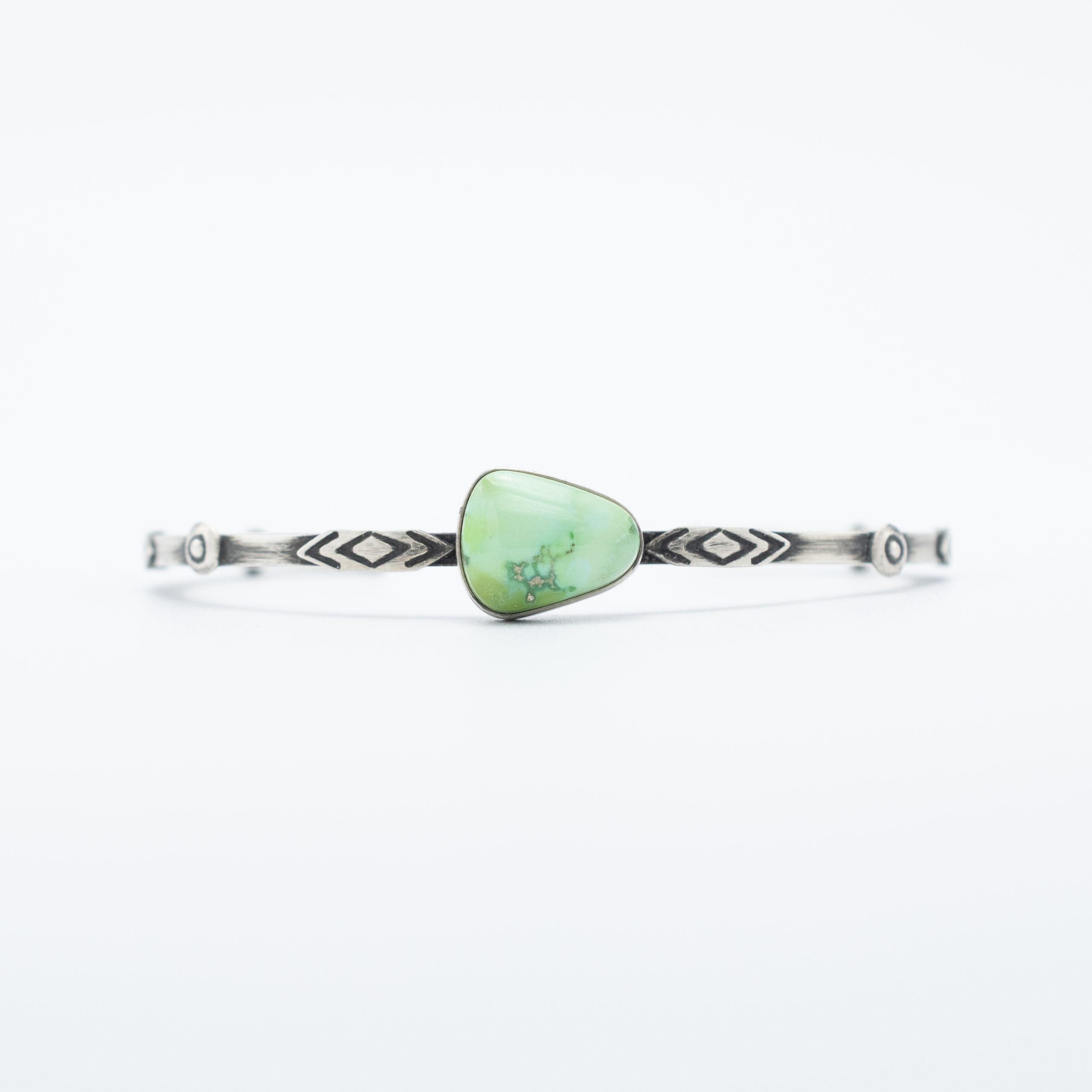 Crafted by Navajo artisan Bryant Martinez, this bracelet features a striking Verde Valley enhanced turquoise stone, known for its rich, earthy green hues and natural matrix. The stone is set in a sterling silver bezel and attached to a shank decorate with applique designs, showcasing intricate hand-stamped details and a refined elegance. The slim silver shank ensures a comfortable and lightweight fit while enhancing the beauty of the turquoise centerpiece. Perfect for everyday wear or special occasions, this bracelet is a beautiful representation of Navajo craftsmanship and Southwestern style.