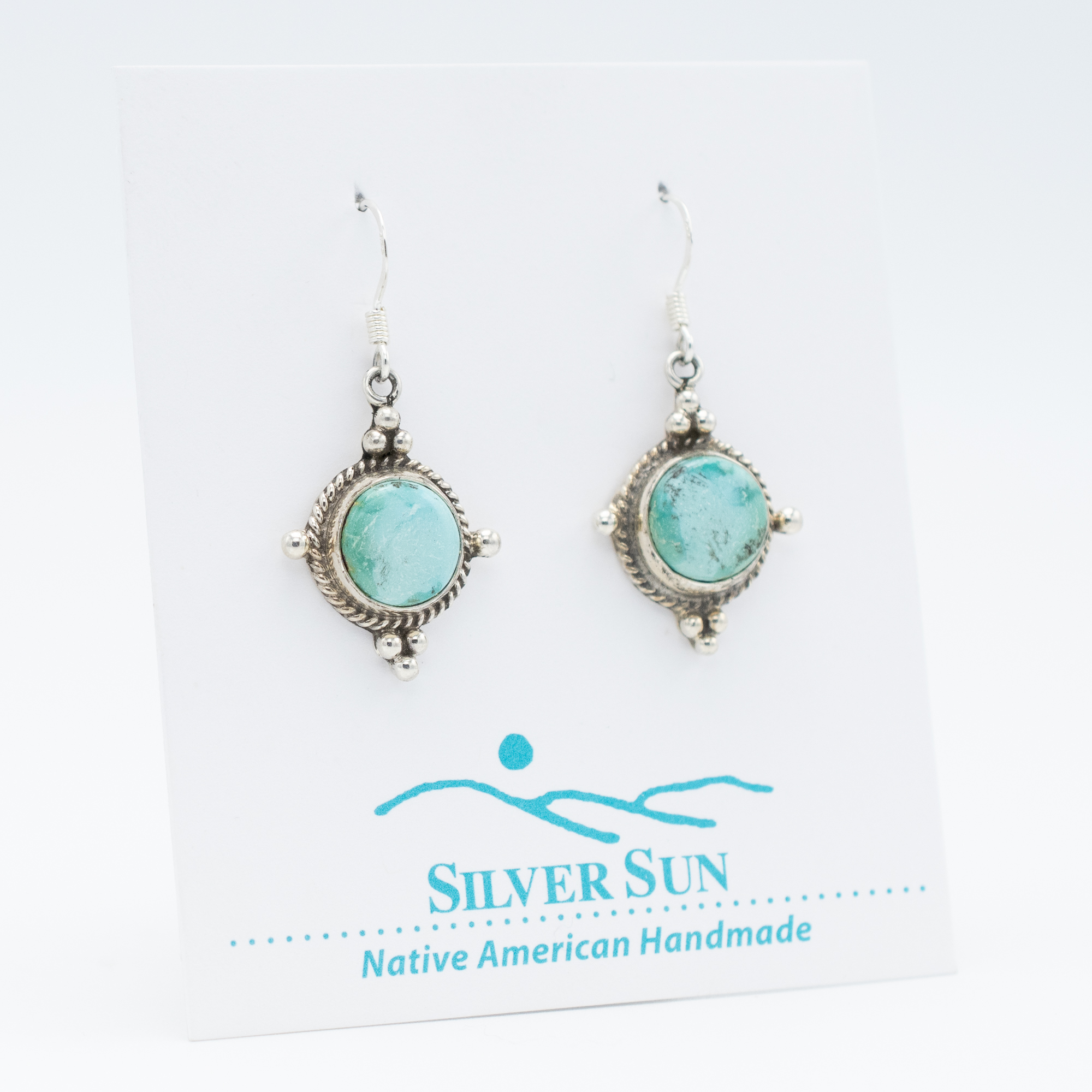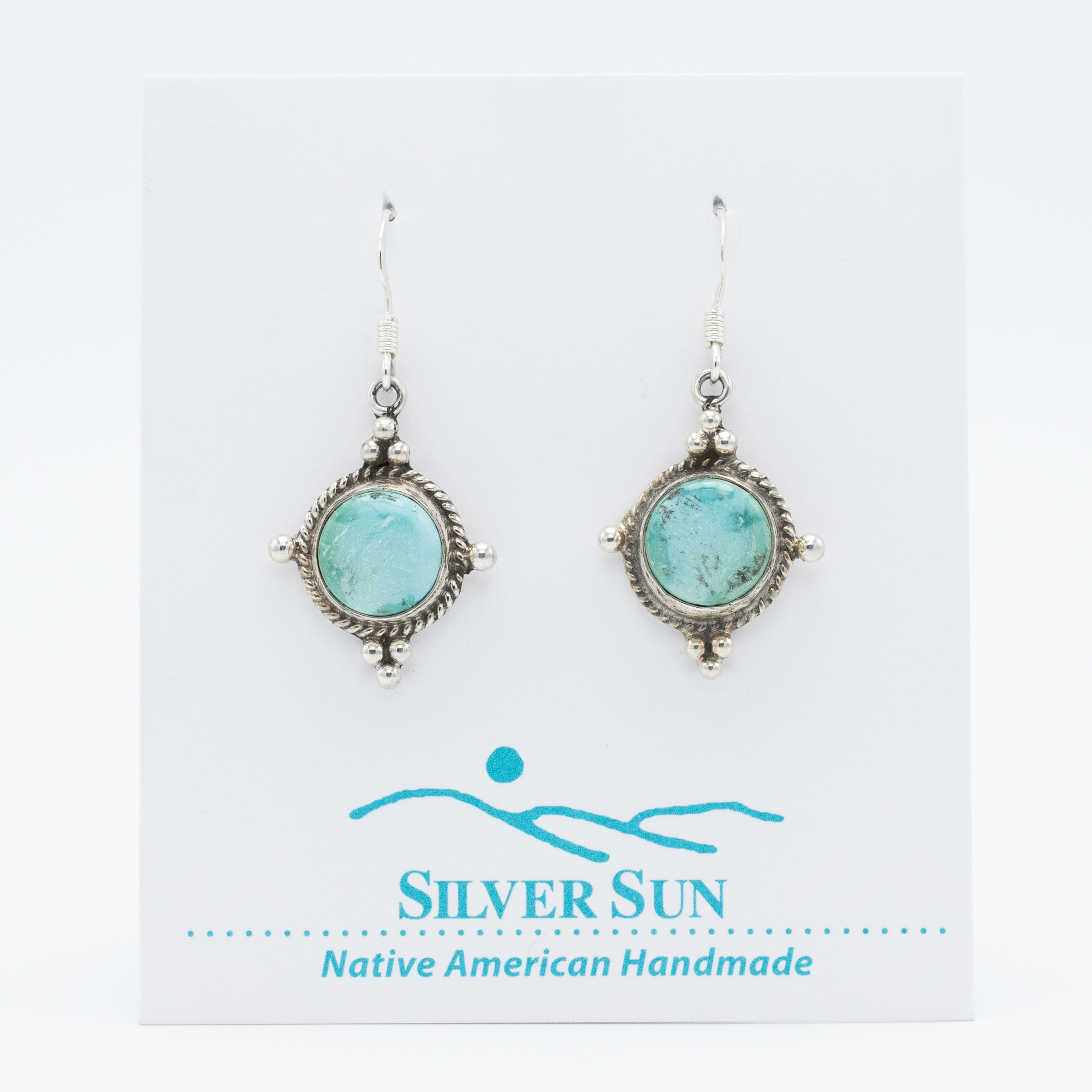 These Enhanced Verde Valley Turquoise Earrings by Navajo artist Ruth Ann Begay feature striking round turquoise stones framed by intricate sterling silver details. The classic rope border and silver bead accents at each corner create a balanced and timeless design. Handcrafted with care, these earrings beautifully highlight the unique character of Verde Valley turquoise, making them a versatile and elegant addition to any jewelry collection.