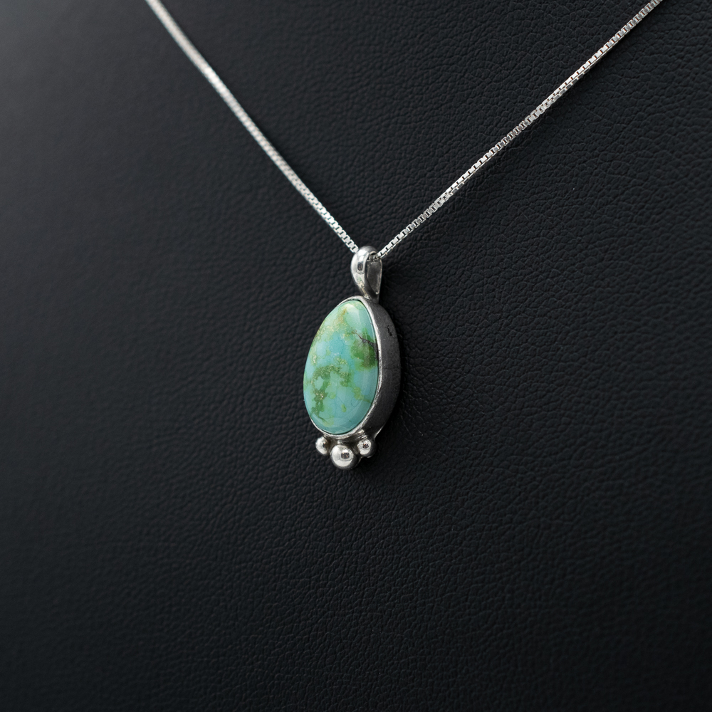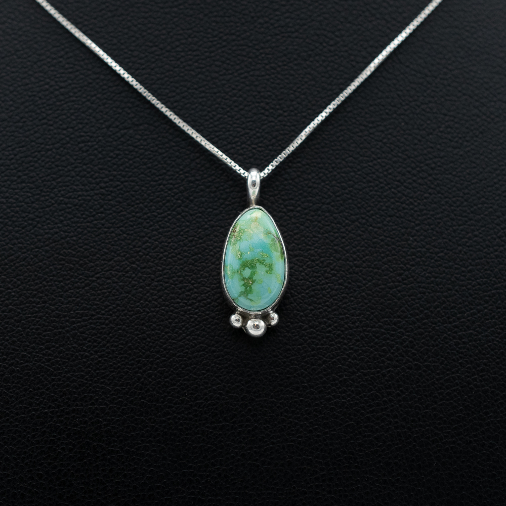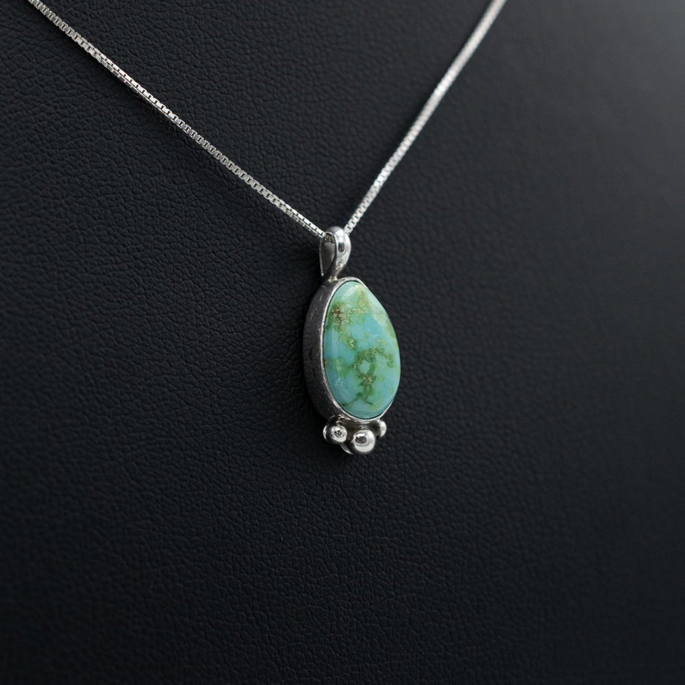 This elegant pendant showcases an enhanced Verde Valley turquoise teardrop, exuding a fresh green hue with delicate natural matrix patterns. The stone is set in a clean sterling silver bezel and adorned with three polished silver spheres at its base, adding a subtle decorative touch. Handcrafted by Navajo artist Ruth Ann Begay, this pendant carries a timeless charm, perfect for everyday wear or special occasions.