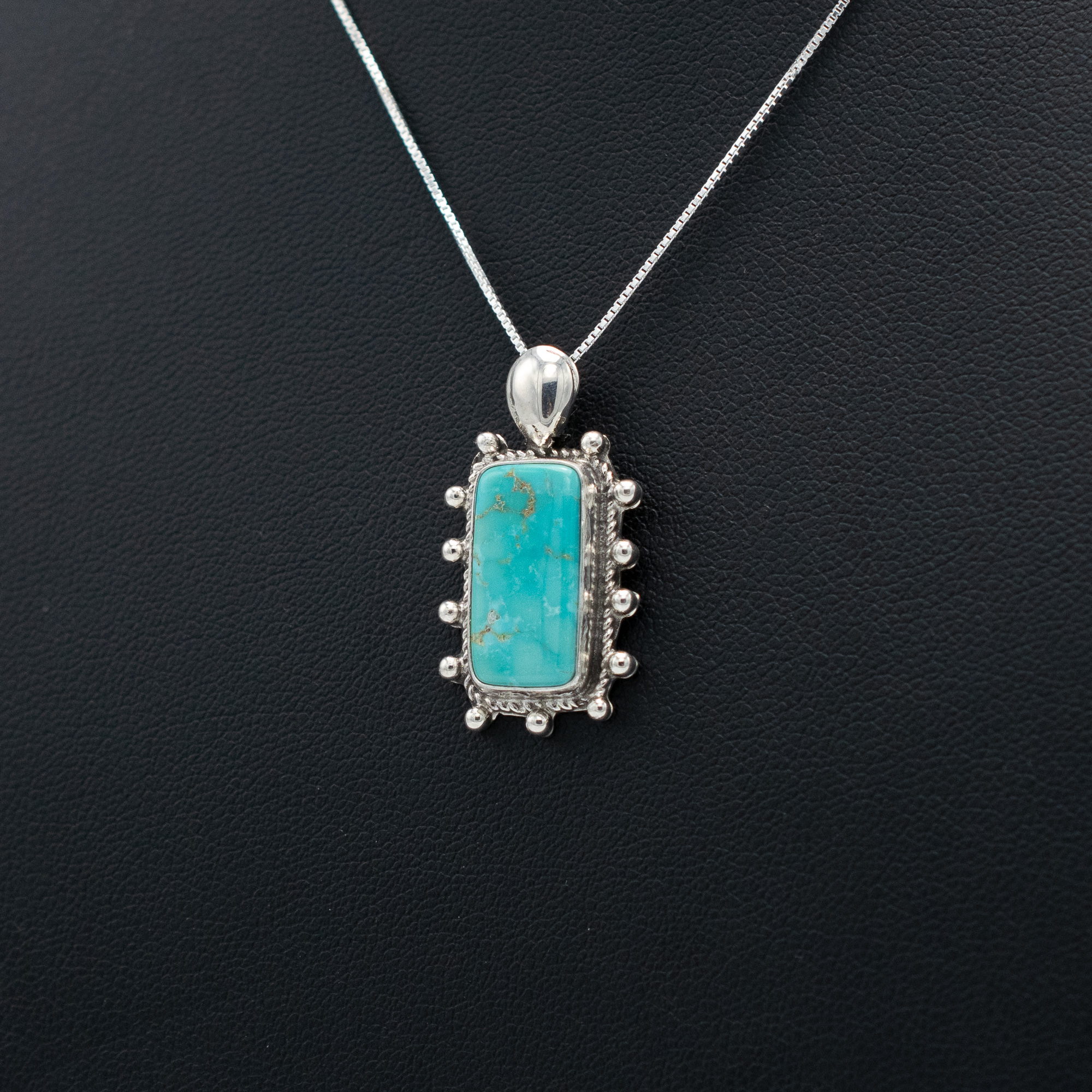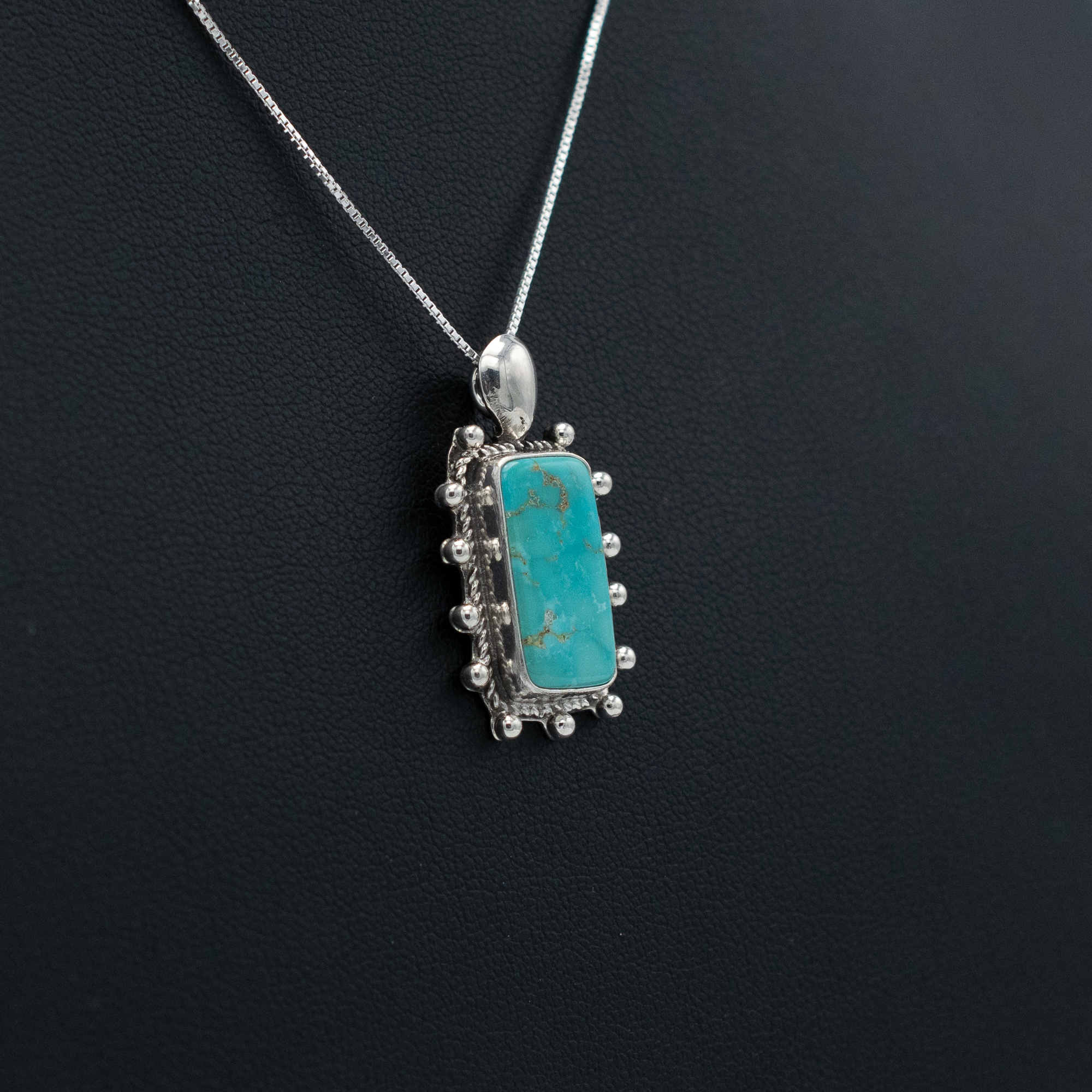 This enhanced Verde Valley Turquoise Pendant by Navajo artist Ruth Ann Begay features a striking rectangular turquoise stone in a sea of silvery detail. The stone’s natural green-blue hues and subtle matrix are framed by a handcrafted sterling silver border accented with a playful arrangement of silver beads. A one-of-a-kind piece that blends traditional Navajo silversmithing with contemporary flair.