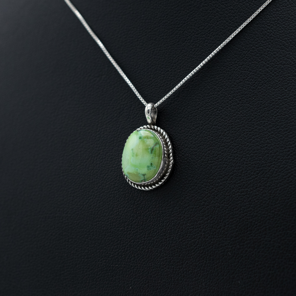 This pendant showcases a stunning Verde Valley turquoise stone, its greenish hues complemented by a twisted sterling silver frame. Handcrafted by Navajo artist Ruth Ann Begay, this piece exudes timeless elegance and understated charm, making it a perfect addition to your collection.