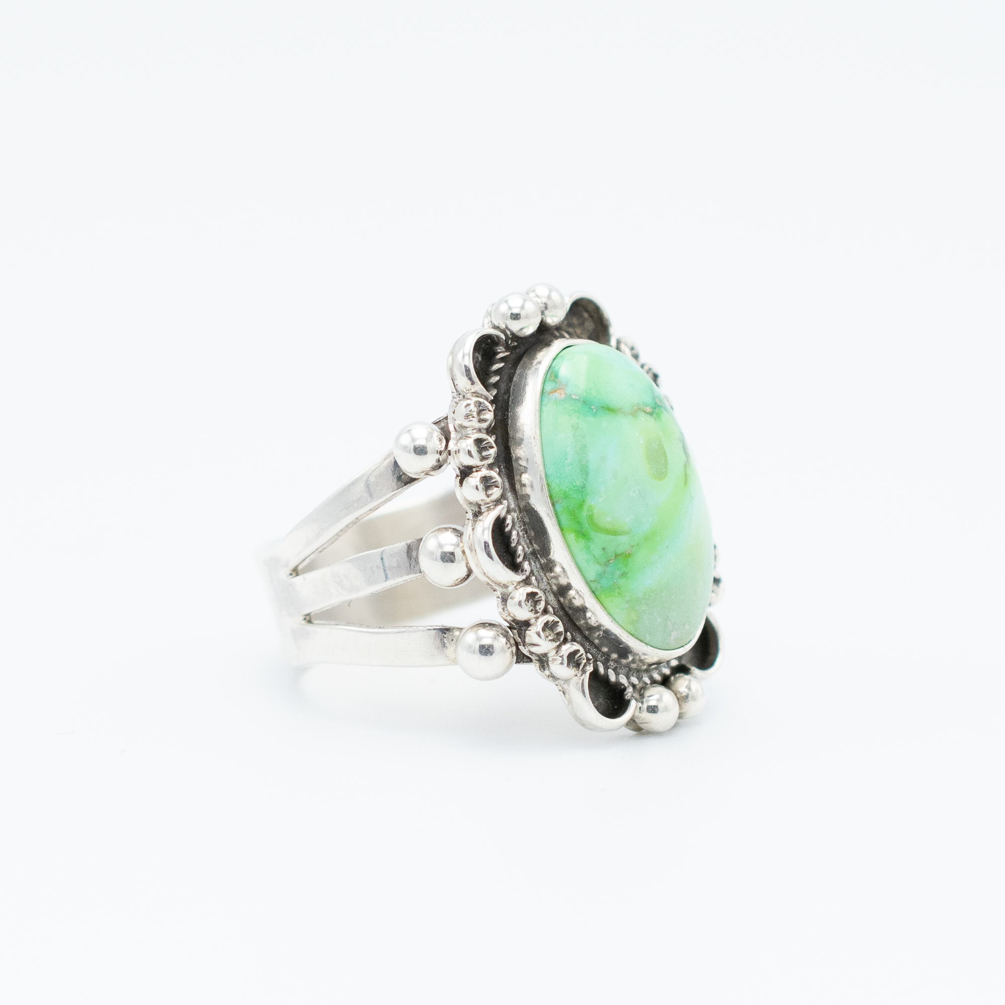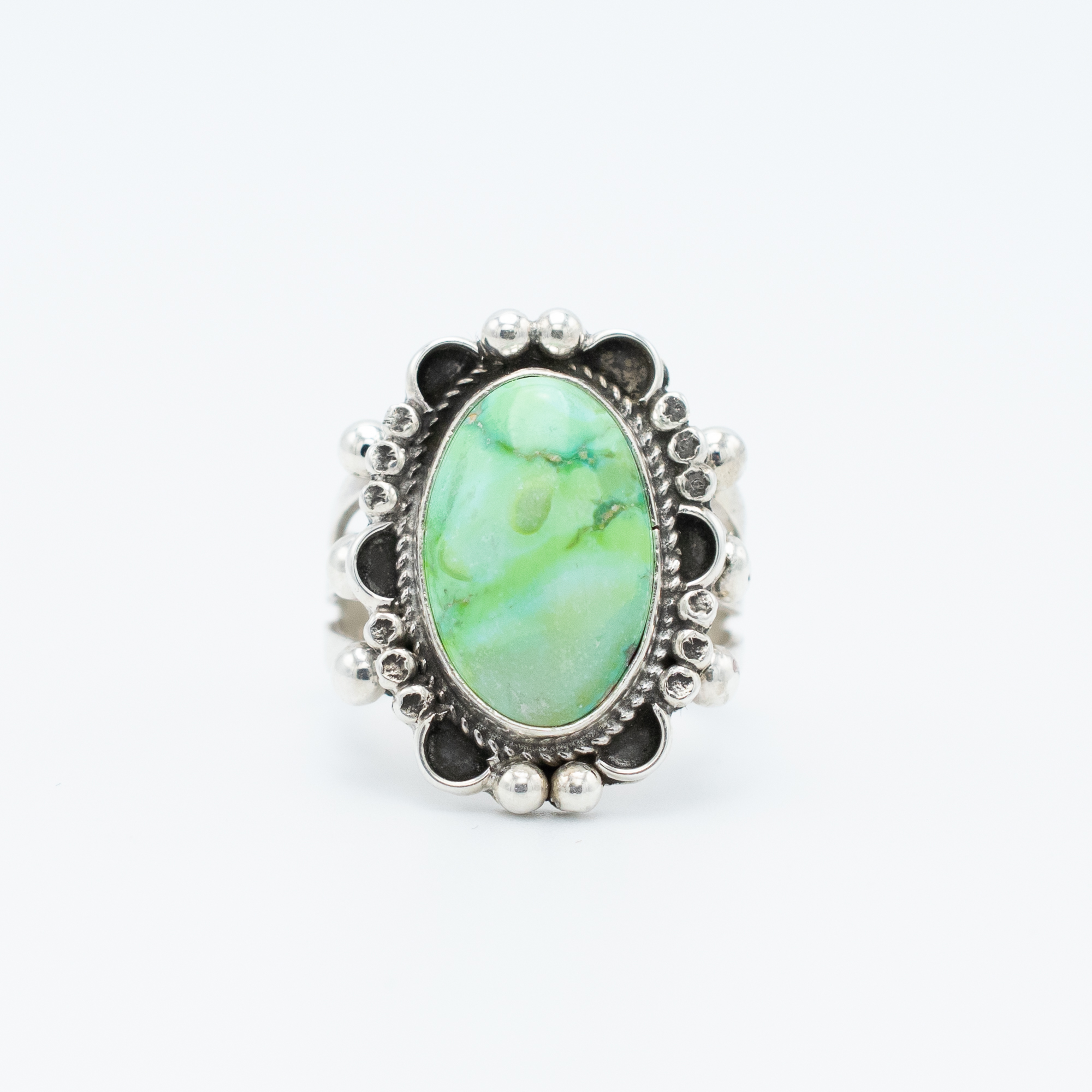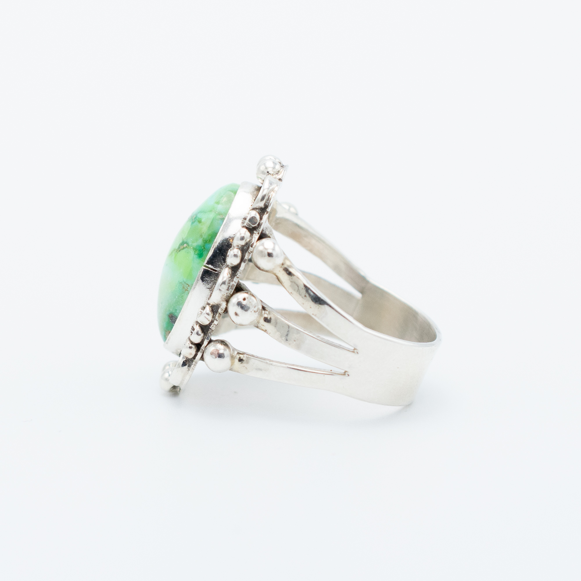 A vibrant piece of wearable art, this Enhanced Verde Valley Turquoise Ring by Ruth Ann Begay, Navajo, showcases a mesmerizing green turquoise stone with delicate matrix patterns. Encased in a sterling silver bezel, the stone is surrounded by intricate beadwork and scalloped detailing, adding depth and texture to the design. The split band offers a comfortable fit while enhancing the bold presence of this handcrafted piece. A beautiful statement ring that highlights the artistry of Navajo silversmithing.