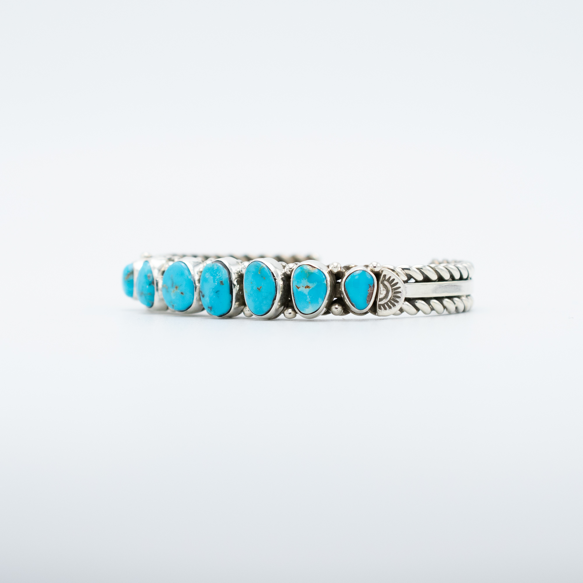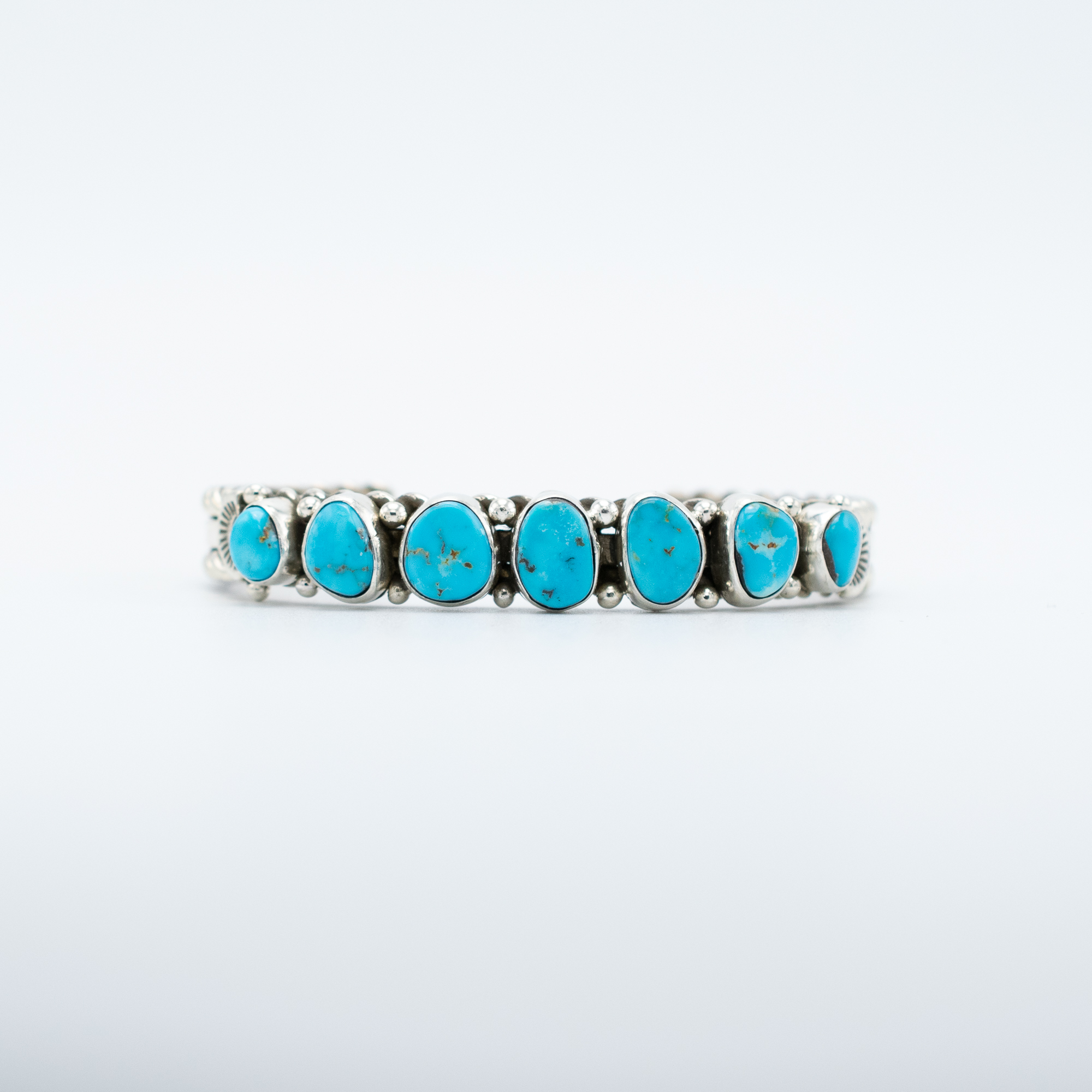 This Natural Villa Grove Turquoise Bracelet by Navajo artist Ruth Ann Begay showcases a stunning row of bright blue turquoise stones, each one hand-selected and bezel set in sterling silver. Silver drops between the stones add texture and balance, while the stampwork on the cuff enhances the traditional craftsmanship. A vibrant and timeless piece for any turquoise lover.