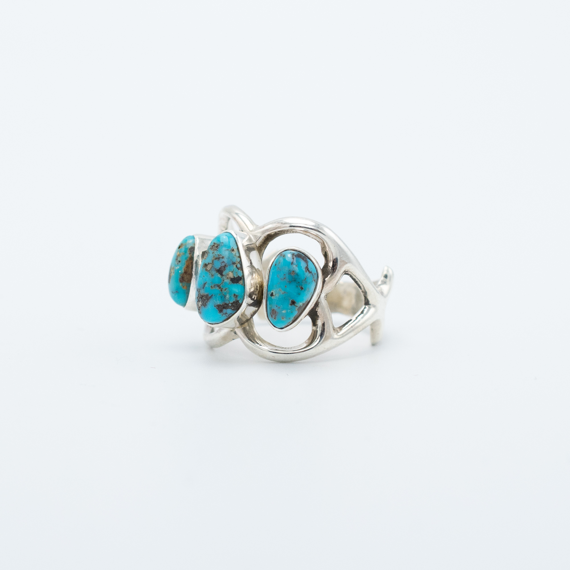 This natural Villa Grove Turquoise Ring by Navajo artist FL Begay features three rich blue stones set in a graceful flowing sterling silver design. The openwork band adds movement and airiness, while the handpicked stones offer a natural balance of boldness and serenity. A striking and wearable piece of Southwestern art.