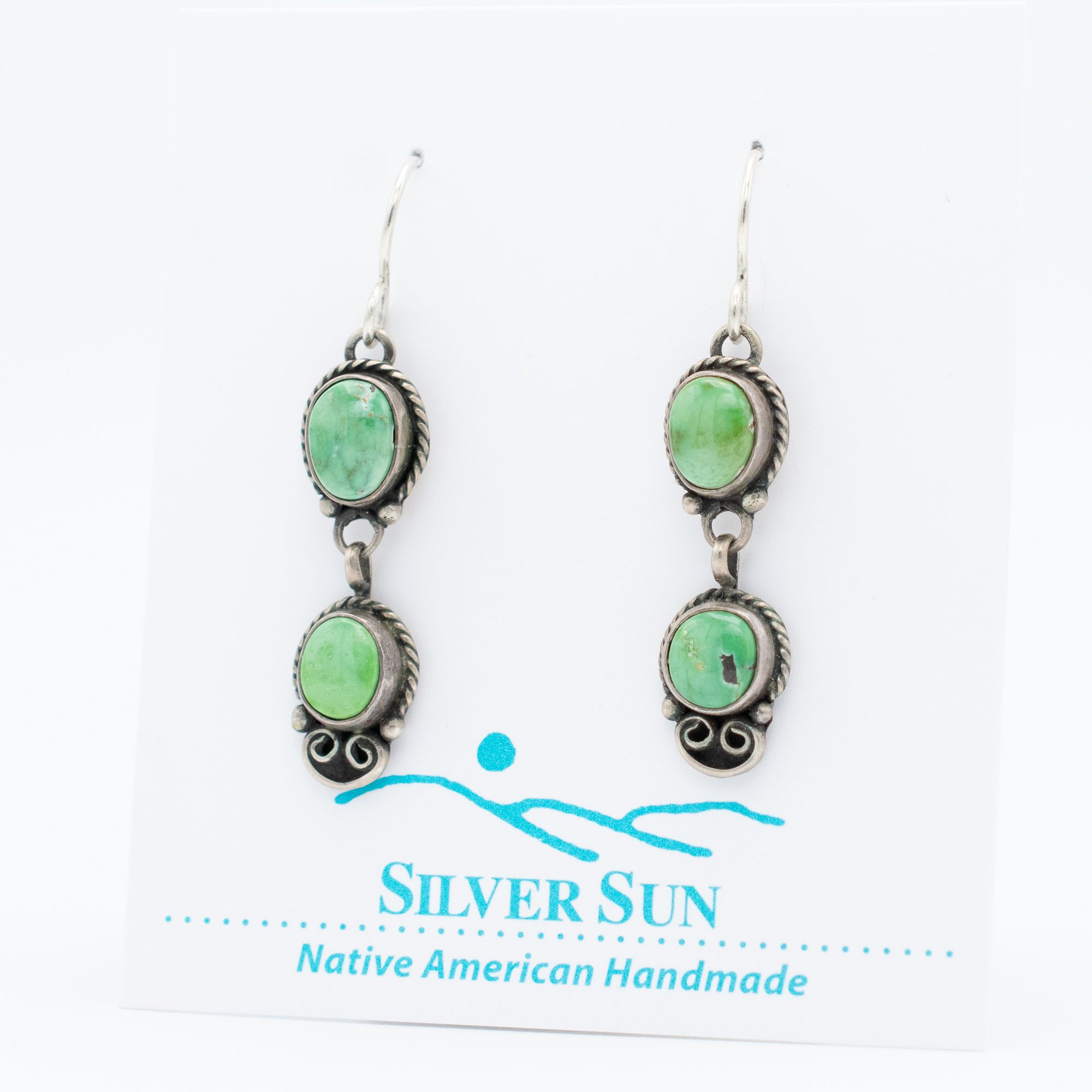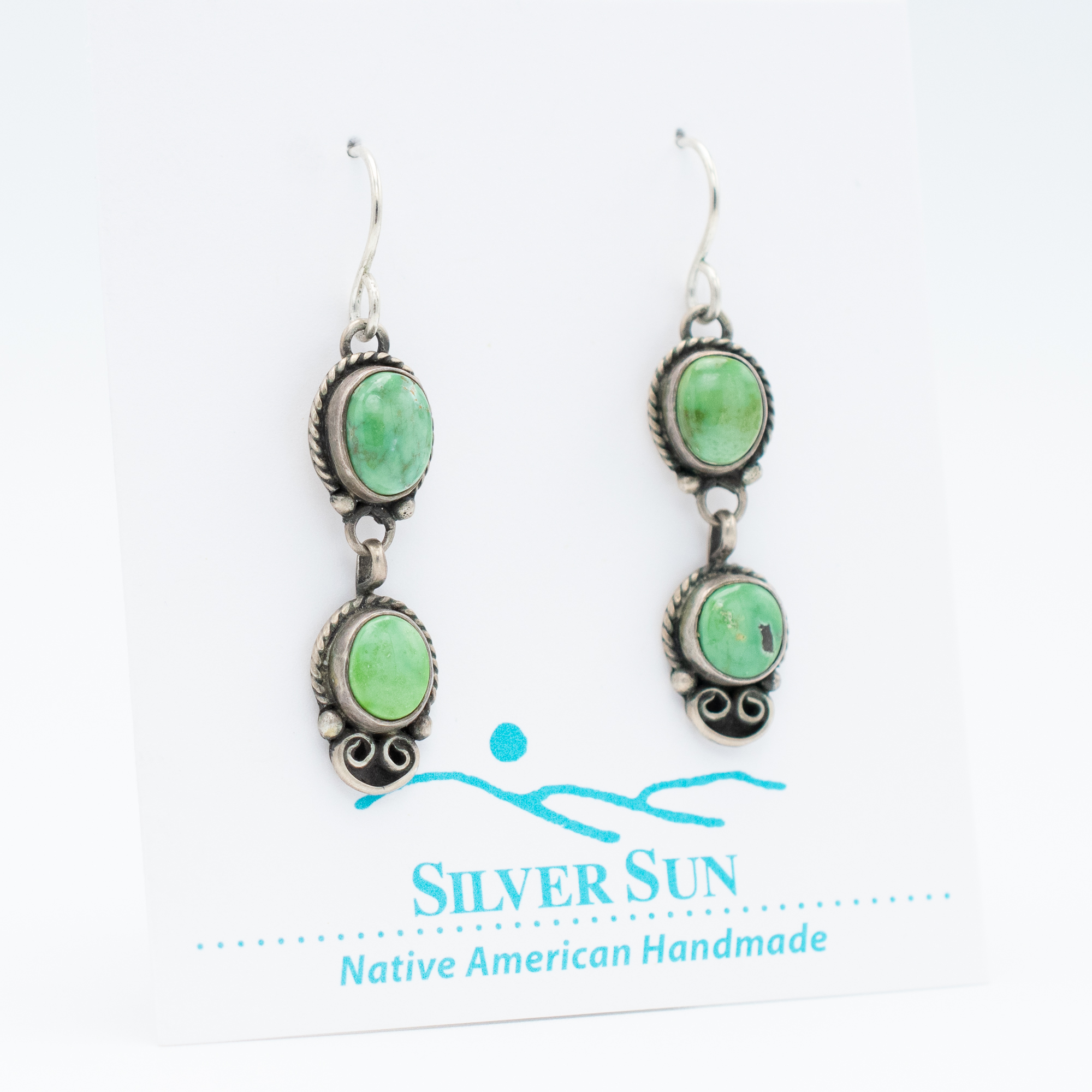 These vintage earrings by Navajo artist Etta Endito feature natural Carico Lake turquoise in soft shades of green. Each oval stone is set in sterling silver with delicate twist wire and hand-stamped details, showcasing classic Southwestern craftsmanship. A timeless design with a distinct vintage charm.