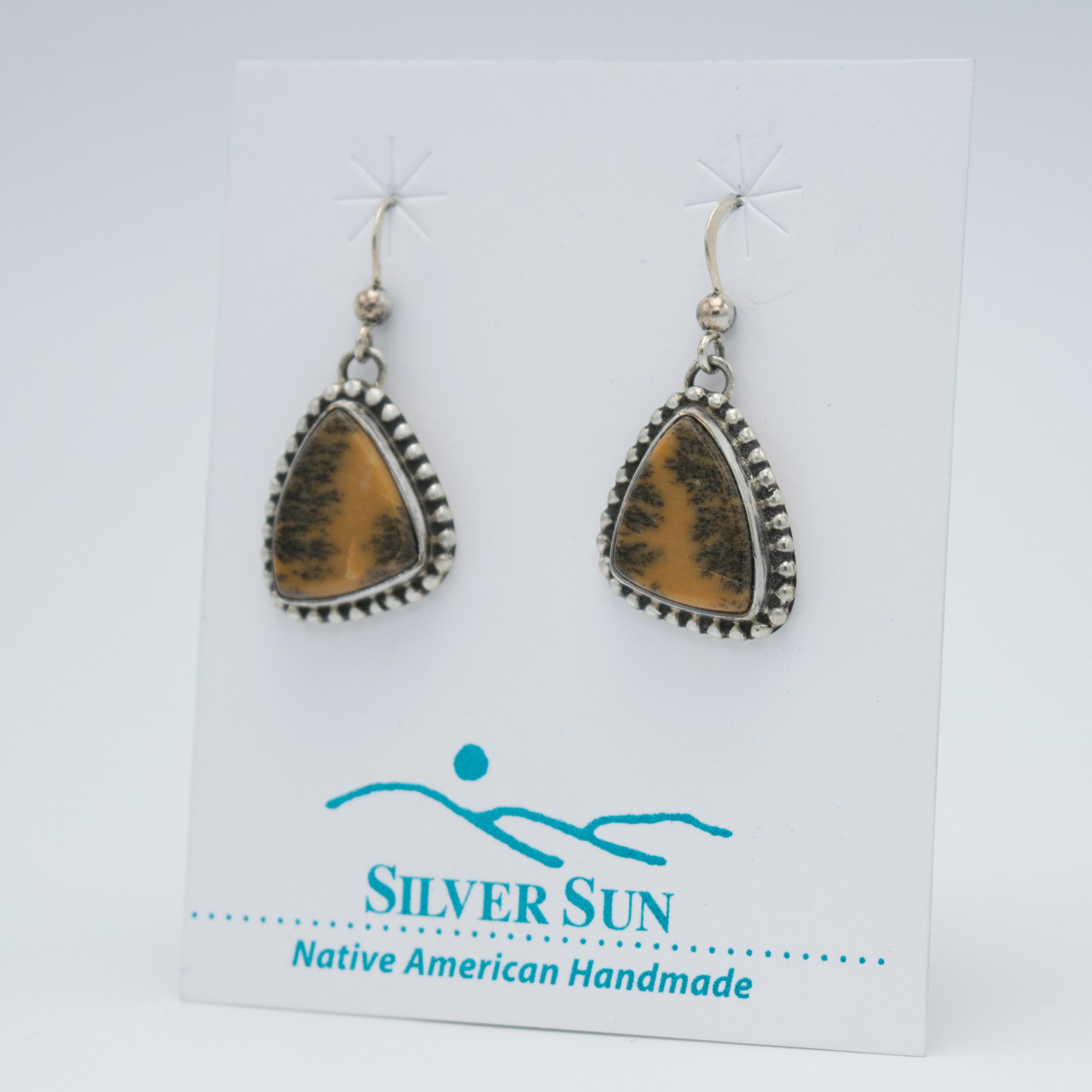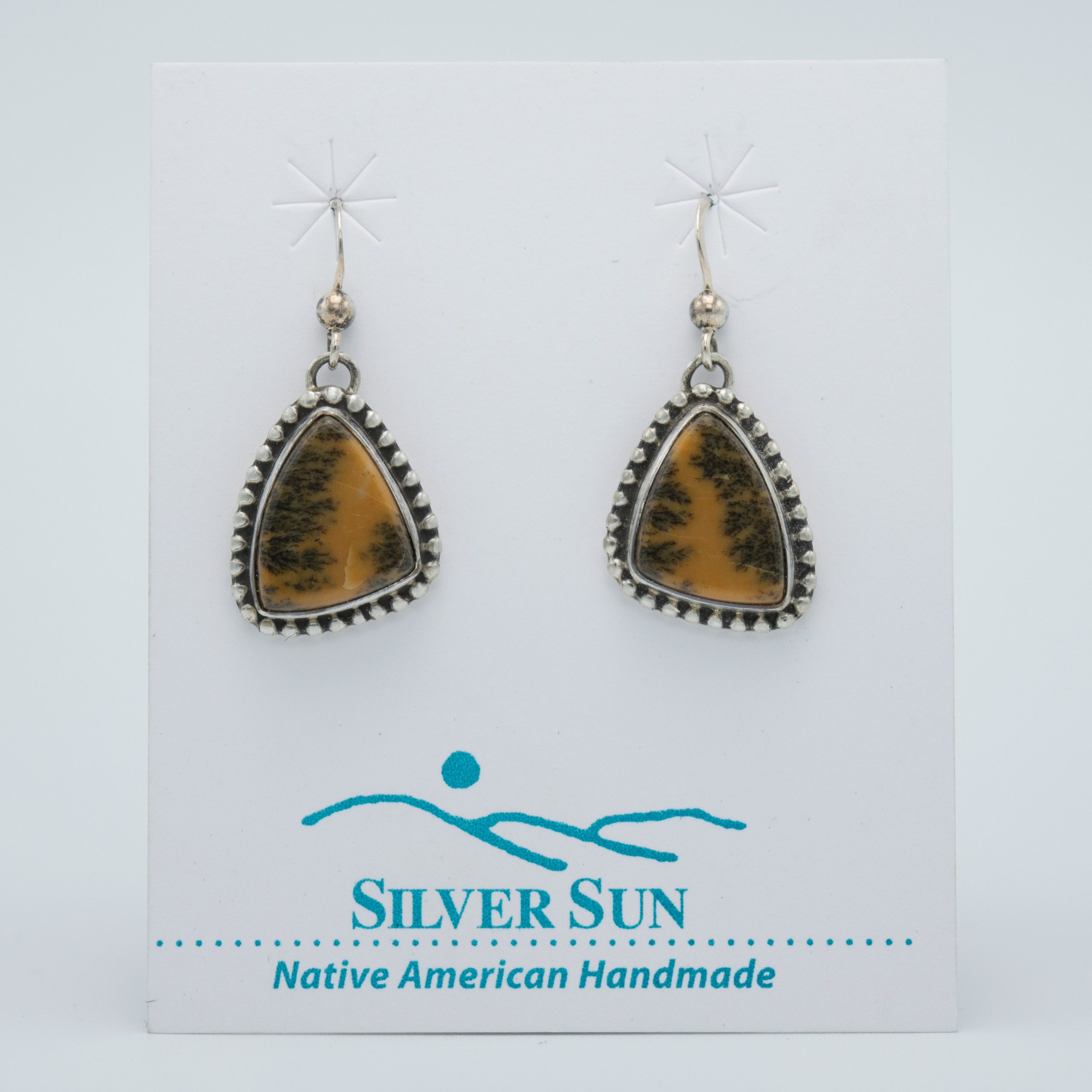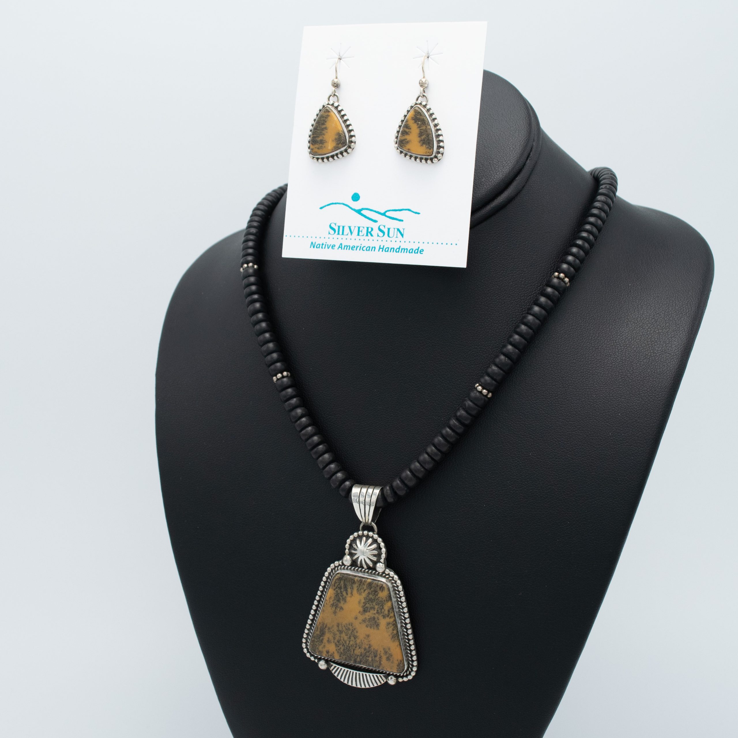 This elegant set by Randy & Etta Endito features a stunning yellow dendritic agate pendant, accented by matte black onyx and small sterling silver beads. The pendant showcases exquisite handcrafted silver work, adding a touch of sophistication. The set is completed with matching dangle earrings, which also feature yellow dendritic agate framed by the same beaded silver wire outline, creating a harmonious and stylish ensemble.