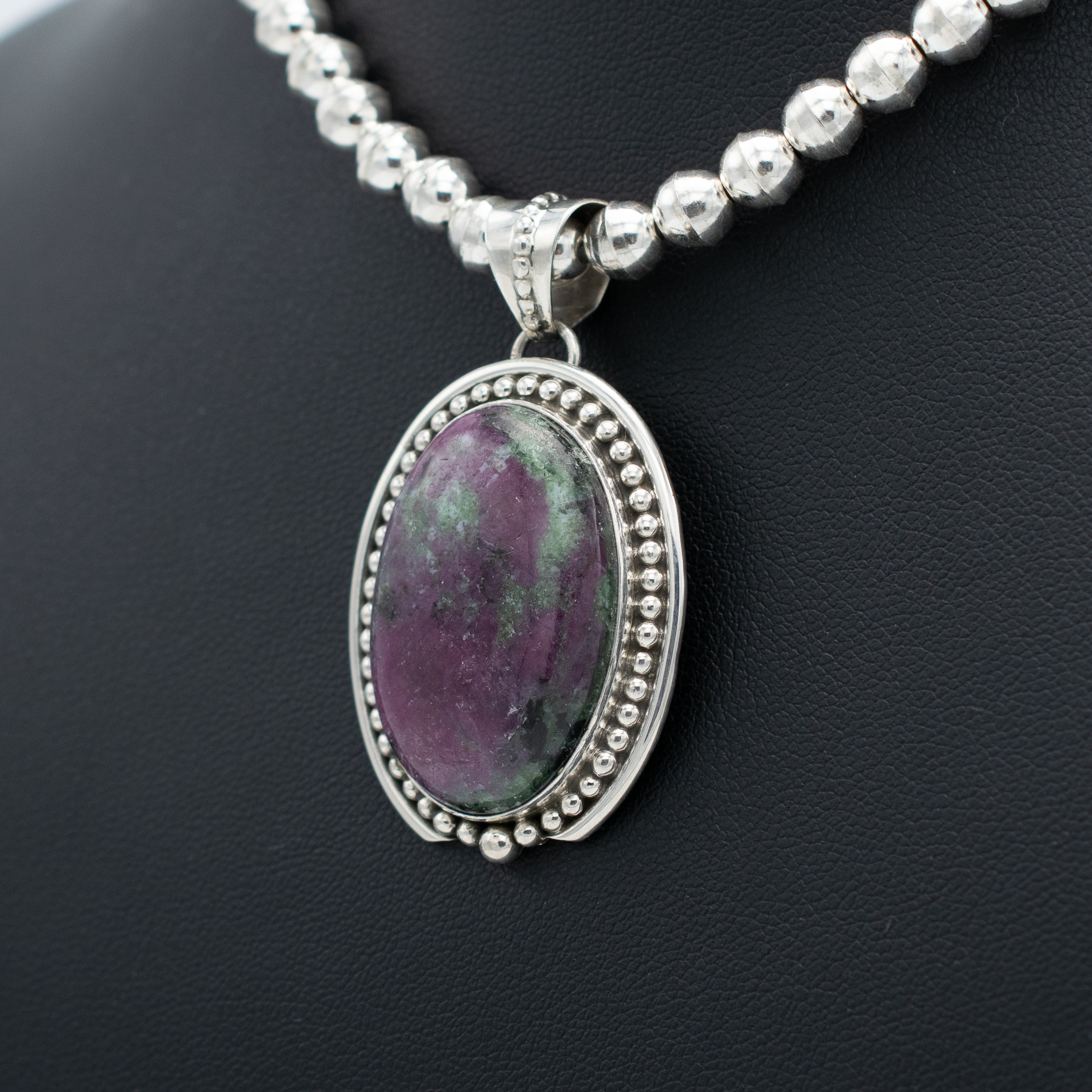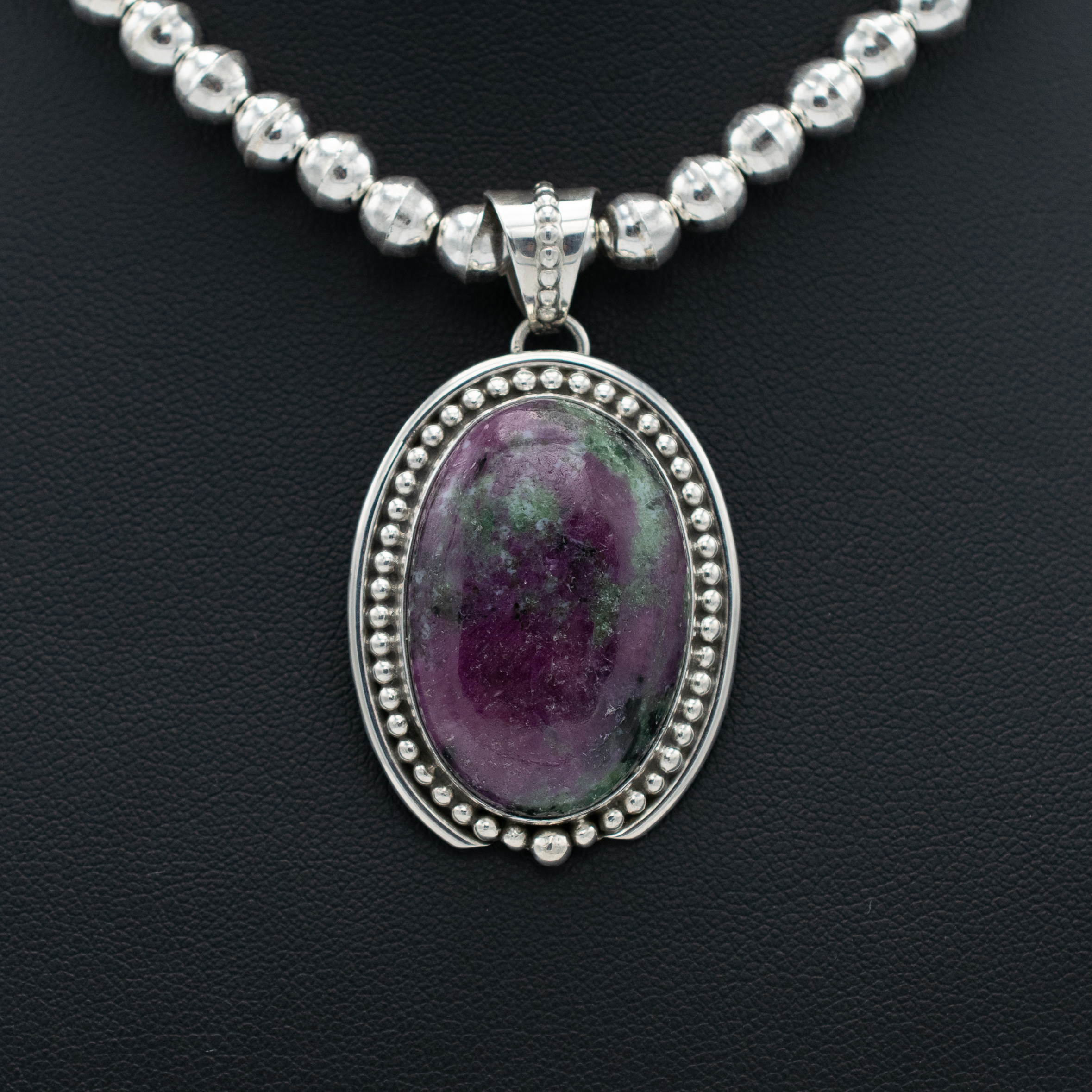 This Zoisite Pendant by Navajo artisan Ruth Ann Begay features an intriguing purple and green stone, framed by intricate bead wire and plain wire. The bale is also adorned with bead wire, adding a touch of elegance to the overall design. Handcrafted with attention to detail, this pendant showcases the unique beauty of zoisite in a sophisticated and stylish setting.