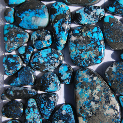 This superb grade was found in an area called Ithaca Peak, which yielded the highest grade and hardest Kingman turquoise. This vein has been exhausted since 1972. The Kingman mine re-opened in September 2004 after being closed since the 1970s. The new owners of the copper mine have contracted to dump anything with turquoise veining or nuggets into trucks for Marty Colbaugh Processing. All of today’s rock comes from Turquoise Mountain.