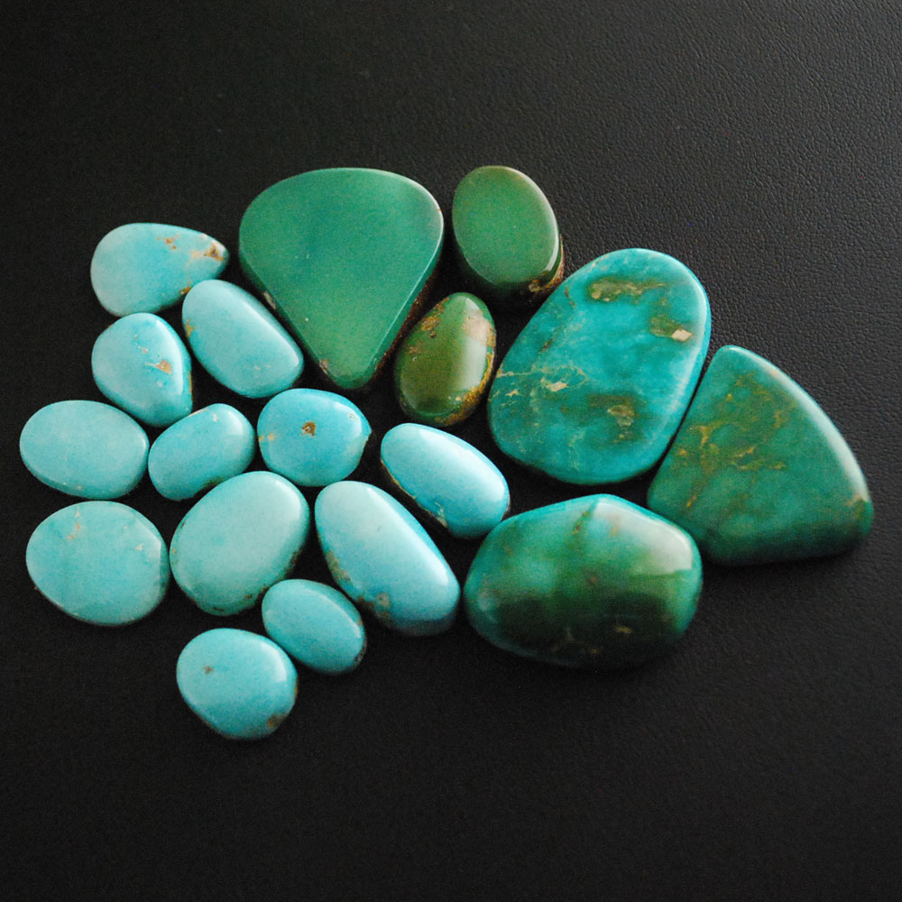 Fourteen years ago, I got one of those infamous “you gotta see the stones I have” phone calls. Never say no. So, the gentleman flew his little plane to Albuquerque with about 80 lbs. A top stonecutter and I picked up about 40 lbs. I love the gentle clear blue in the rough turquoise . . . these are smaller pieces . . . hard and shiny.